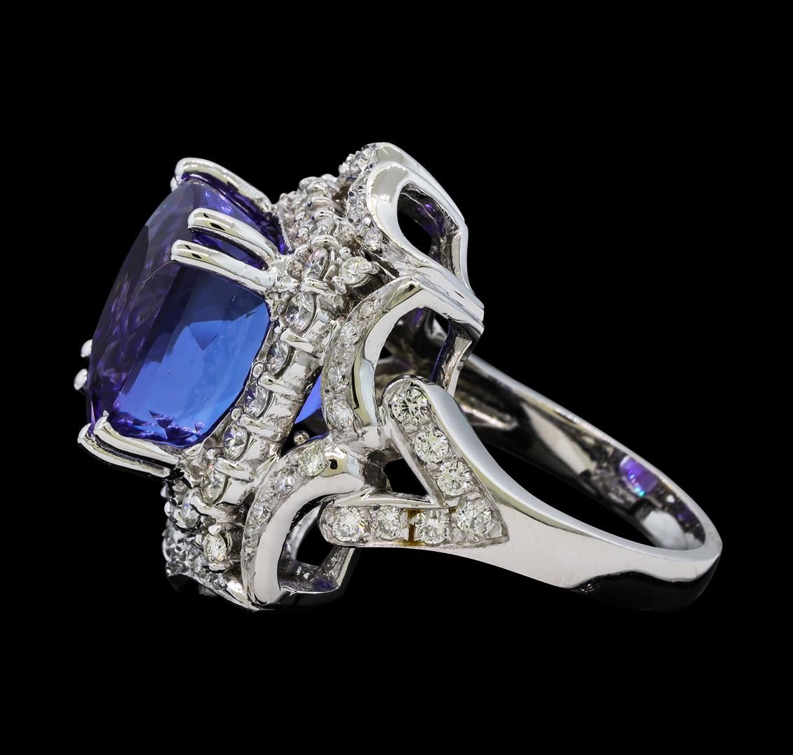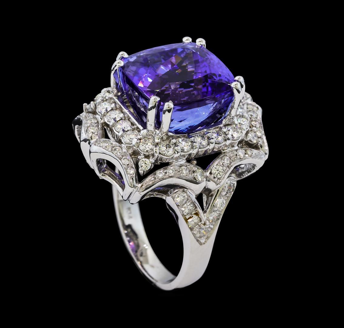 One electronically tested 14KT white gold lady's cast fashion ring with a split shank scalloped basket halo with a bright polish finish. The featured lady's ring has a shank measuring 3.05 millimeters wide. Identified with markings of 'K14'. Condition is new, good workmanship. Containing: One prong set square cushion modified brilliant cut natural tanzanite, measuring 12.55 x 12.70 x 11.57mm, (depth est.) 10%. bulge factor, approximate weight of 15.95ct., clarity is eye clean, medium dark, moderately strong, violetish blue color, (GIA vB 6/4), cut is very good. Transmitting light with no distortion, transparent. Colored gemstones are presumed to have been subjected to commonly used enhancement processes. Graded in the setting. Twenty-Two prong set round brilliant cut diamonds, measuring 2.10 - 2.00 x 1.27mm (depth est.) approximate total weight of 22 Stones = 0.72ct. Graded in the setting. Clarity SI-1 to SI-2. Color: H - I Cut Good Fourteen prong set round brilliant cut diamonds, measuring 1.75 - 1.65 x 1.04mm (depth est.) approximate total weight of 14 Stones = 0.26ct. Graded in the setting. Clarity SI-1 to SI-2. Color: G - I Cut Good Thirty-Six prong set round brilliant cut diamonds, measuring 1.60 - 1.20 x 0.84mm (depth est.) approximate total weight of 36 Stones = 0.33ct. Graded in the setting. Clarity SI-1 to SI-2. Color: H - I Cut Good. Total Weight of Colored Stones 15.95ct.. Total Weight of Diamonds 1.31ct.. Total Weight of Ring 14.00gm. GAS Appraised at $24,175.00.
