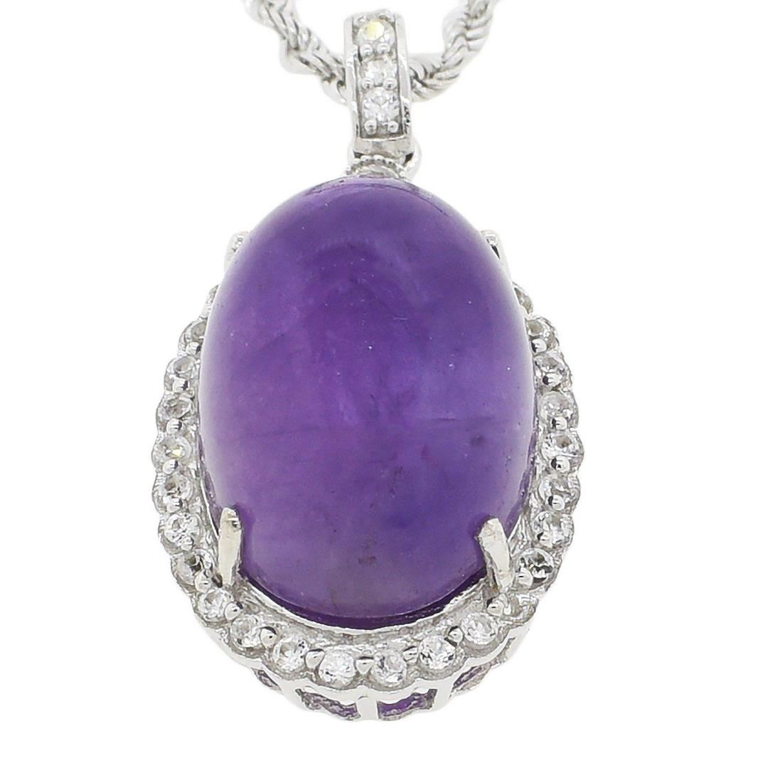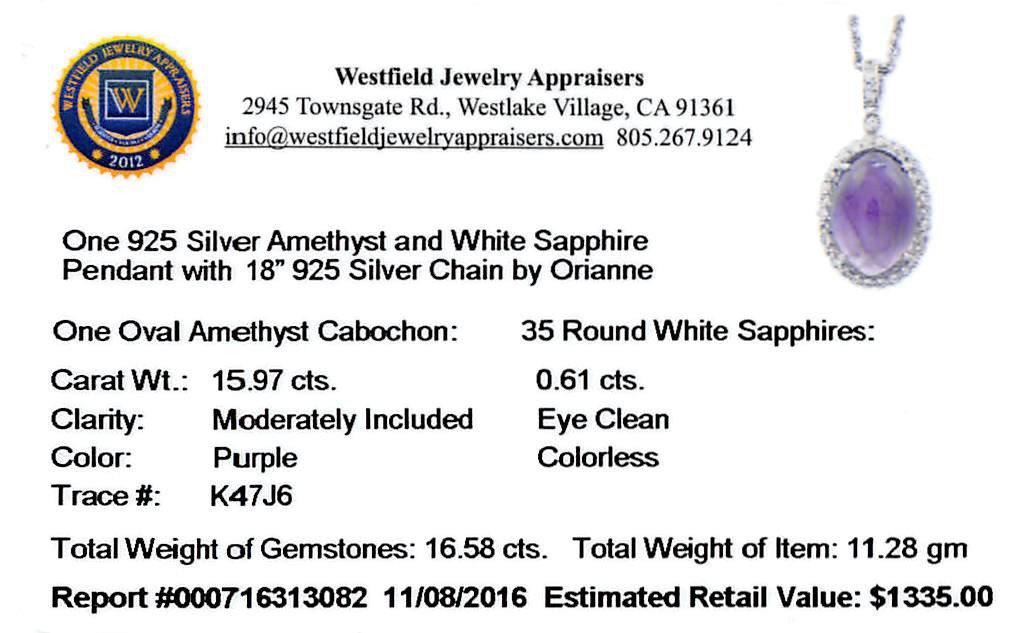 Electronically tested 925 silver ladies cast & assembled amethyst and white sapphire pendant with chain. The pendant features an amethyst cabochon set within a white sapphire bezel, completed by a white sapphire set bail. The pendant is supported by an eighteen inch length 925 silver rope chain, terminating in a lobster claw clasp. Bright polish finish with milgrain detailing. Trademark is Orianne. Identified with markings of "925". Condition is new, good workmanship. One prong set oval cabochon cut natural amethyst approximate weight of 15.97ct., clarity is moderately included, type II, medium dark, very slightly grayish, purple color, (GIA P 6/3), cut is good. Transmitting light somewhat diffusely, transparent to translucent. Naturally occurring internal & external characteristics are present. Graded in the setting. Thirty-five prong & bezel set round mixed cut natural white sapphires approximate total weight of 0.61ct., clarity is eye clean, colorless, very slightly grayish, white color, (GIA W 0/3), cut is good. Transmitting light with no distortion, transparent. Color grade is an average for the group. Graded in the setting. #LREF-476