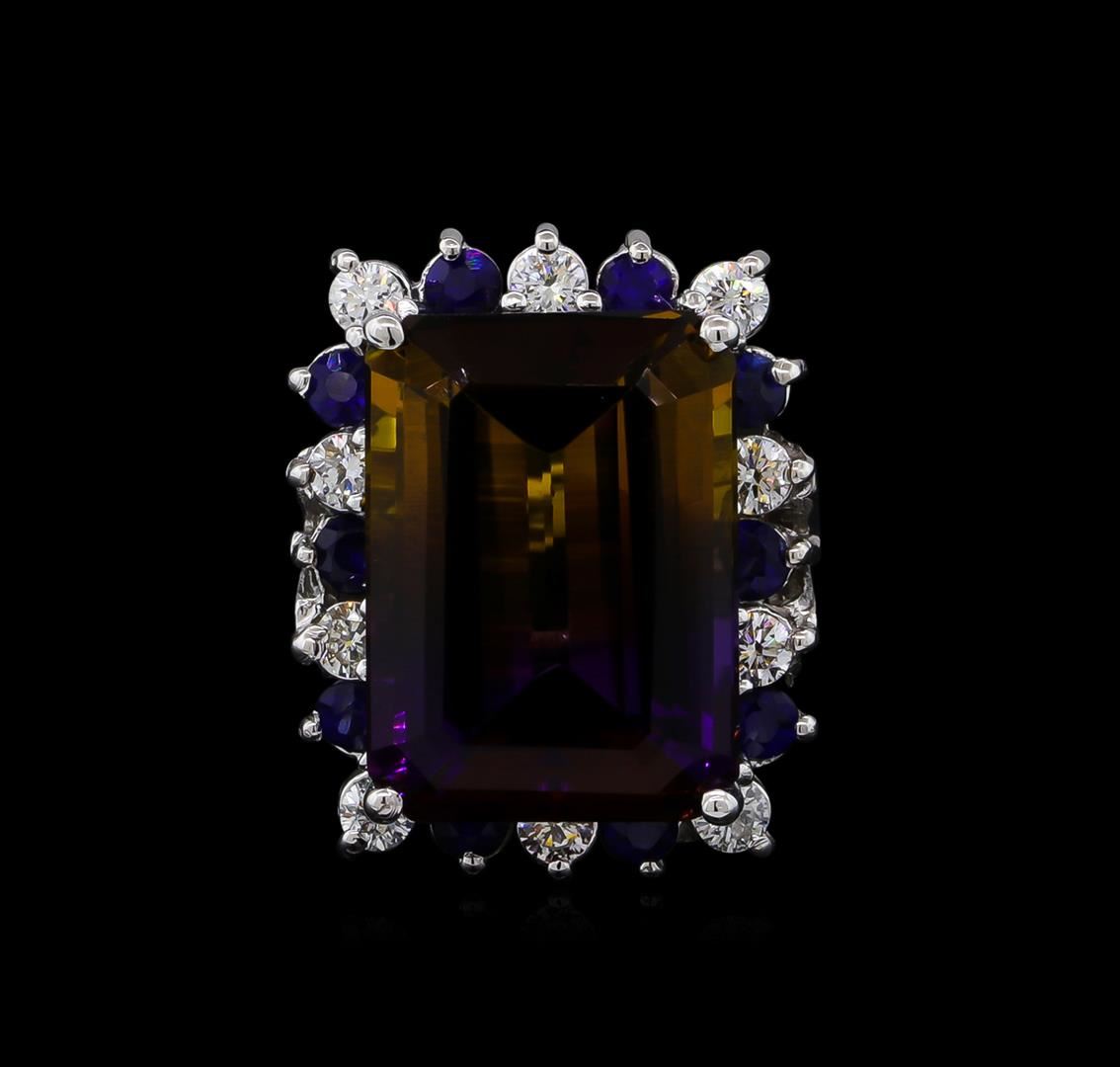 One electronically tested 14KT white gold ladies cast ametrine, sapphire and diamond ring with a bright polish finish. The featured ametrine is set within a sapphire and diamond bezel supported by a ribbed under gallery, completed by a three millimeter wide band. Identified with markings of "14K". Condition is new, good workmanship. Containing: One prong set rectangular step cut natural ametrine quartz, measuring 18.00 x 13.20 x 9.00mm, approximate weight of 15.97ct., clarity is eye clean, type I, dark, moderately strong, purple color, (GIA P 7/4) to medium dark, moderately strong, orangy yellow, (GIA oY 6/4), cut is good. Transmitting light with no distortion, transparent. Graded in the setting. Ten prong set round mixed cut natural blue sapphires approximate. Total Weight of 1.08ct., clarity is slightly included, type II, dark, moderately strong, blue color, (GIA B 7/4), cut is good. Transmitting light with a minimum of distortion, transparent. Naturally occurring internal & external characteristics are present. Indications of laboratory high temperature diffusion treatment. Color grade is an average for the group. Graded in the setting. Ten prong set round brilliant cut diamonds approximate. Total Weight of 10 Stones = 0.75ct. Graded in the setting. Clarity: SI-1 to SI-2. Color: E - F. Total Weight of Colored Stones 17.05ct. Total Weight of Diamonds 0.75ct. Total Weight of Ring 13.48gm. AIG Appraised at $5,245.00.