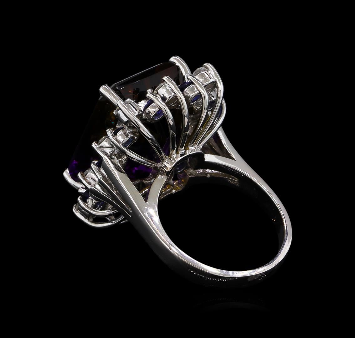 One electronically tested 14KT white gold ladies cast ametrine, sapphire and diamond ring with a bright polish finish. The featured ametrine is set within a sapphire and diamond bezel supported by a ribbed under gallery, completed by a three millimeter wide band. Identified with markings of "14K". Condition is new, good workmanship. Containing: One prong set rectangular step cut natural ametrine quartz, measuring 18.00 x 13.20 x 9.00mm, approximate weight of 15.97ct., clarity is eye clean, type I, dark, moderately strong, purple color, (GIA P 7/4) to medium dark, moderately strong, orangy yellow, (GIA oY 6/4), cut is good. Transmitting light with no distortion, transparent. Graded in the setting. Ten prong set round mixed cut natural blue sapphires approximate. Total Weight of 1.08ct., clarity is slightly included, type II, dark, moderately strong, blue color, (GIA B 7/4), cut is good. Transmitting light with a minimum of distortion, transparent. Naturally occurring internal & external characteristics are present. Indications of laboratory high temperature diffusion treatment. Color grade is an average for the group. Graded in the setting. Ten prong set round brilliant cut diamonds approximate. Total Weight of 10 Stones = 0.75ct. Graded in the setting. Clarity: SI-1 to SI-2. Color: E - F. Total Weight of Colored Stones 17.05ct. Total Weight of Diamonds 0.75ct. Total Weight of Ring 13.48gm. AIG Appraised.