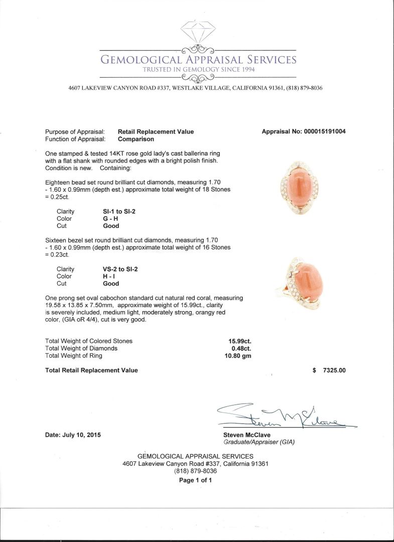 One stamped & tested 14KT rose gold lady's cast ballerina ring with a flat shank with rounded edges with a bright polish finish. Condition is new. Containing: Eighteen bead set round brilliant cut diamonds, measuring 1.70 - 1.60 x 0.99mm (depth est.) approximate total weight of 18 Stones = 0.25ct. Clarity: SI-1 to SI-2. Color: G - H. Cut: Good. Sixteen bezel set round brilliant cut diamonds, measuring 1.70 - 1.60 x 0.99mm (depth est.) approximate total weight of 16 Stones = 0.23ct. Clarity: VS-2 to SI-2. Color: H - I. Cut: Good. One prong set oval cabochon standard cut natural red coral, measuring 19.58 x 13.85 x 7.50mm, approximate weight of 15.99ct., clarity is severely included, medium light, moderately strong, orangy red color, (GIA oR 4/4), cut is very good. Total Weight of Colored Stones: 15.99ct. Total Weight of Diamonds: 0.48ct. Total Weight of Ring: 10.80 gm. GAS Appraised at $7,325.00.