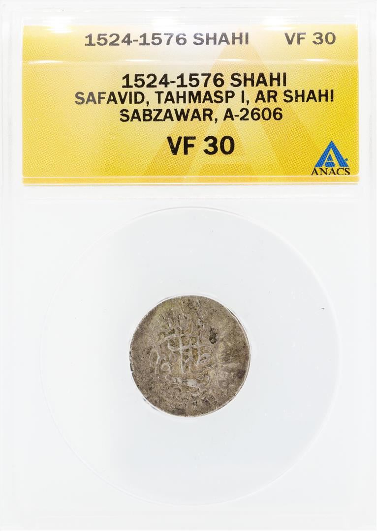 One 1524-1576 Shahi Safavid Tahmasp I AR Shahi Sabzawar A-2606 Coin ANACS VF30. ANACS Appraised.