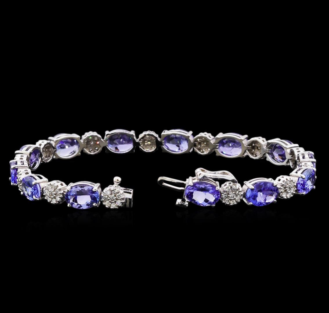 One electronically tested 14KT white gold lady's combination cast & assembled fashion straight line bracelet with a tongue clasp with foldover safety with a bright polish finish. The featured lady's bracelet is 7.25 inches in length. Identified with markings of "14K". Condition is new, good workmanship. Containing: Thirteen prong set oval modified brilliant cut natural tanzanites, measuring 7.90 x 5.90 x 3.72mm, (depth est.) approximate total weight of 16.02ct., clarity is eye clean, medium, moderately strong, violetish blue color, (GIA vB 5/4), cut is good. Transmitting light with no distortion, transparent. Colored gemstones are presumed to have been subjected to commonly used enhancement processes. Graded in the setting. Thirteen prong set round brilliant cut diamonds, measuring 1.60 - 1.50 x 0.98mm (depth est.) approximate total weight of 13 Stones = 0.20ct. Graded in the setting. Clarity: VS-2 to SI-1. Color: G - Good Ninety-One prong set round brilliant cut diamonds, measuring 1.40 - 1.35 x 0.83mm (depth est.) approximate total weight of 91 Stones = 0.92ct. Graded in the setting. Clarity: SI-1 to SI-2. Color: G - Good. Total Weight of Colored Stones 16.02ct. Total Weight of Diamonds 1.12ct. Total Weight of Straight Line Bracelet 14.70gm. GAS Appraised at $21,800.00.