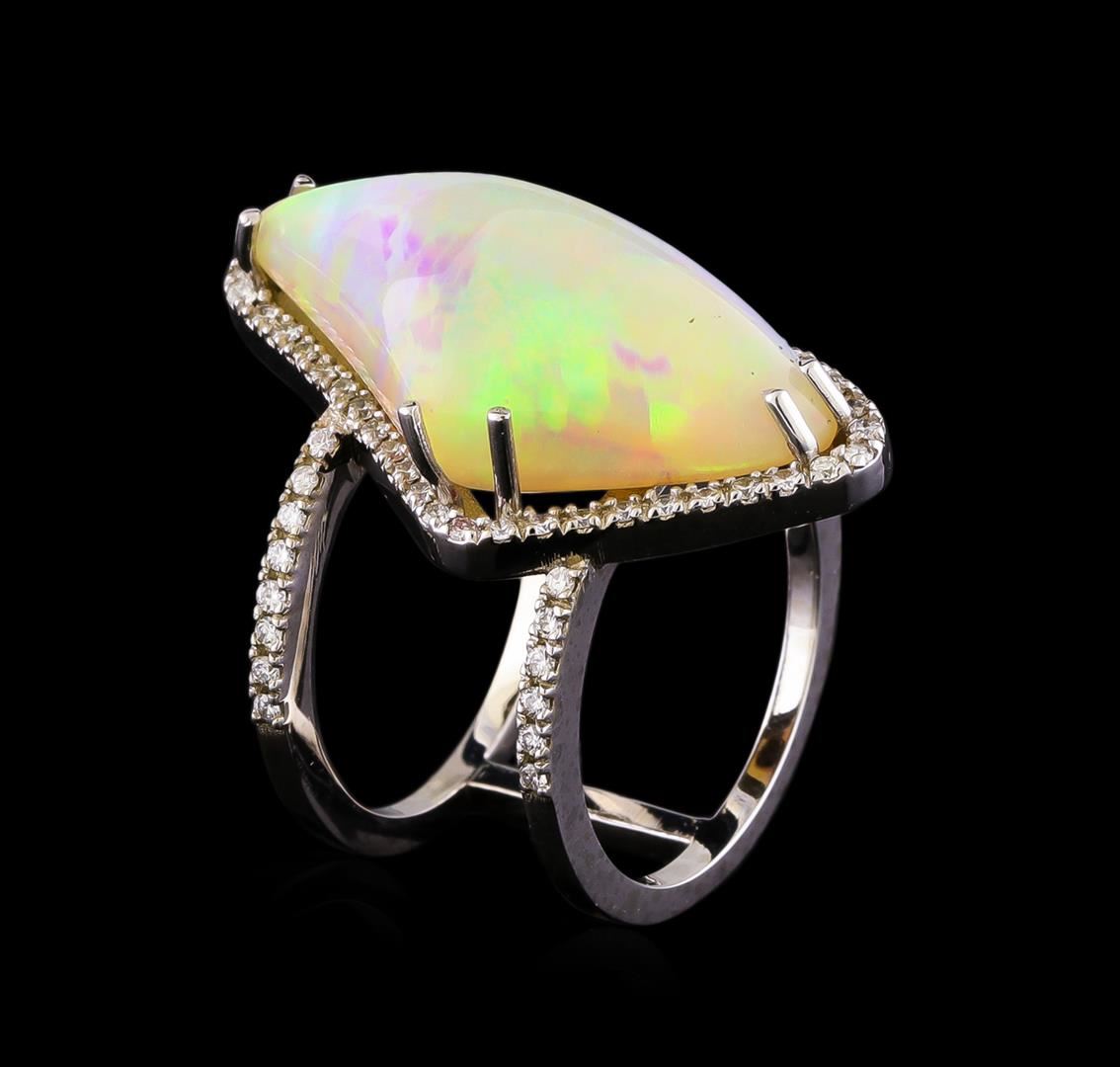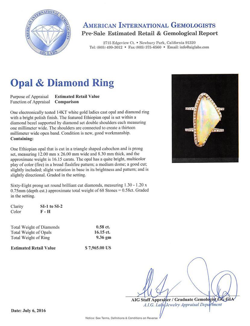 One electronically tested 14KT white gold ladies cast opal and diamond ring with a bright polish finish. The featured Ethiopian opal is set within a diamond bezel supported by diamond set double shoulders each measuring one millimeter wide. The shoulders are connected to create a thirteen millimeter wide open band. Condition is new, good workmanship. Containing: One semi crystal opal that is cut in a triangle shaped cabochon and is prong set, measuring 12.00 mm long x 26.00 mm wide, and 8.30 mm thick and the approximate weight is 16.15 carats. The opal has a quite bright, multicolor play of color (fire) in a broad flashfire pattern; a medium dome; a good cut; slightly included; slight variation in base in its brightness and pattern; and is slightly directional. Graded in the setting. Sixty-Eight prong set round brilliant cut diamonds, measuring 1.30 - 1.20 x 0.75mm (depth est.) approximate total weight of 68 Stones = 0.58ct. Graded in the setting. Clarity: SI-1 to SI-2. Color: F - H. Total Weight of Diamonds 0.58ct. Total Weight of Opals 16.15ct. Total Weight of Ring 9.36gm. AIG Appraised at $7,965.00.