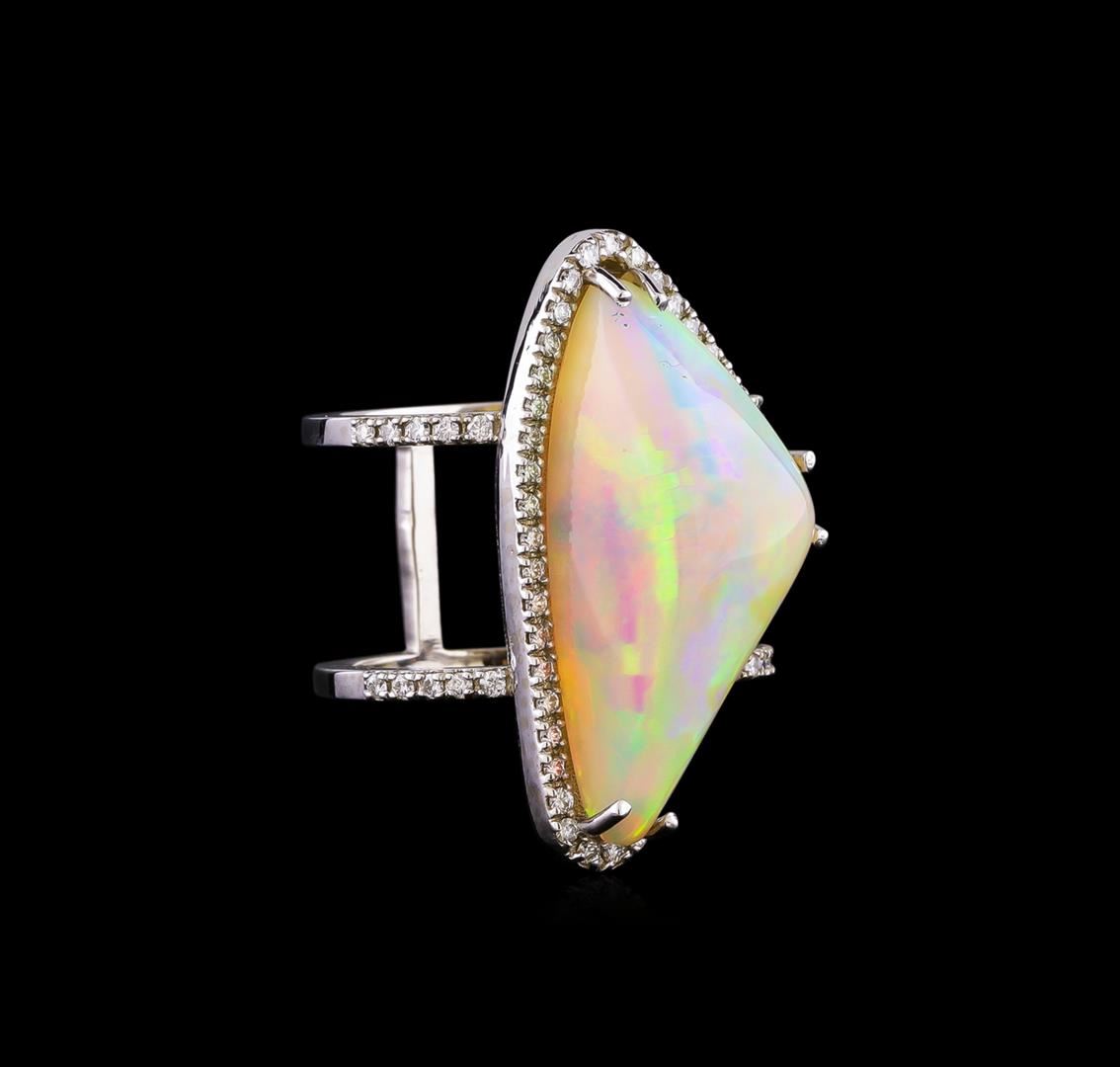 One electronically tested 14KT white gold ladies cast opal and diamond ring with a bright polish finish. The featured Ethiopian opal is set within a diamond bezel supported by diamond set double shoulders each measuring one millimeter wide. The shoulders are connected to create a thirteen millimeter wide open band. Condition is new, good workmanship. Containing: One semi crystal opal that is cut in a triangle shaped cabochon and is prong set, measuring 12.00 mm long x 26.00 mm wide, and 8.30 mm thick and the approximate weight is 16.15 carats. The opal has a quite bright, multicolor play of color (fire) in a broad flashfire pattern; a medium dome; a good cut; slightly included; slight variation in base in its brightness and pattern; and is slightly directional. Graded in the setting. Sixty-Eight prong set round brilliant cut diamonds, measuring 1.30 - 1.20 x 0.75mm (depth est.) approximate total weight of 68 Stones = 0.58ct. Graded in the setting. Clarity: SI-1 to SI-2. Color: F - H. Total Weight of Diamonds 0.58ct. Total Weight of Opals 16.15ct. Total Weight of Ring 9.36gm. AIG Appraised at $7,965.00.