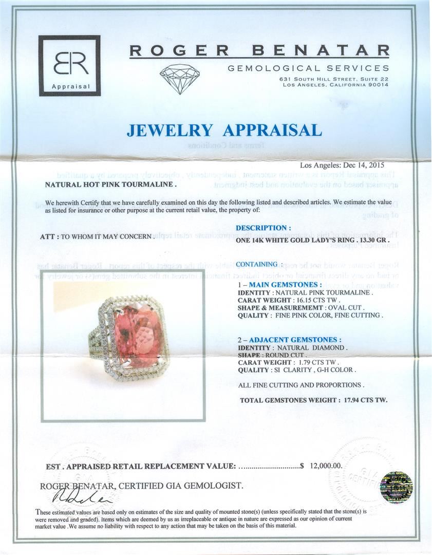 One 14KT White Gold Lady's Ring with a total weight of 13.30 grams. Containing: Main Gemstones: Identity: Natural Pink Tourmaline. Carat Weight: 16.15 cts tw. Shape & Measurement: Oval Cut. Quality: Fine Pink Color, Fine Cutting. Adjacent Gemstones: Identity: Natural Diamond. Shape: Round Cut. Carat Weight: 1.79 cts tw. Quality: SI Clarity, G-H Color. All Fine Cutting and proportions. Total Gemstones weight: 17.94 cts tw. RBGS Appraised at $12,000.00.