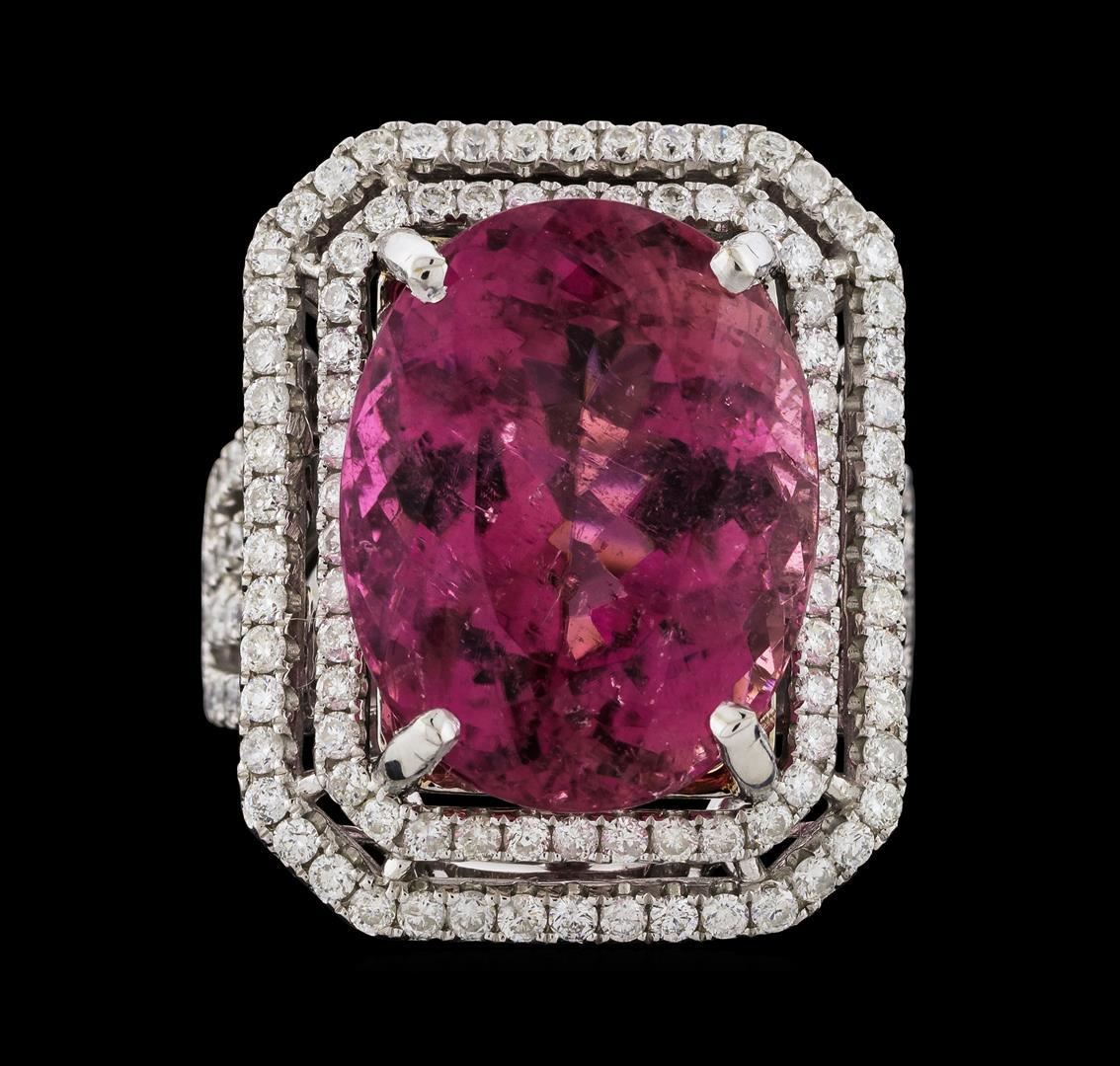 One 14KT White Gold Lady's Ring with a total weight of 13.30 grams. Containing: Main Gemstones: Identity: Natural Pink Tourmaline. Carat Weight: 16.15 cts tw. Shape & Measurement: Oval Cut. Quality: Fine Pink Color, Fine Cutting. Adjacent Gemstones: Identity: Natural Diamond. Shape: Round Cut. Carat Weight: 1.79 cts tw. Quality: SI Clarity, G-H Color. All Fine Cutting and proportions. Total Gemstones weight: 17.94 cts tw. RBGS Appraised.