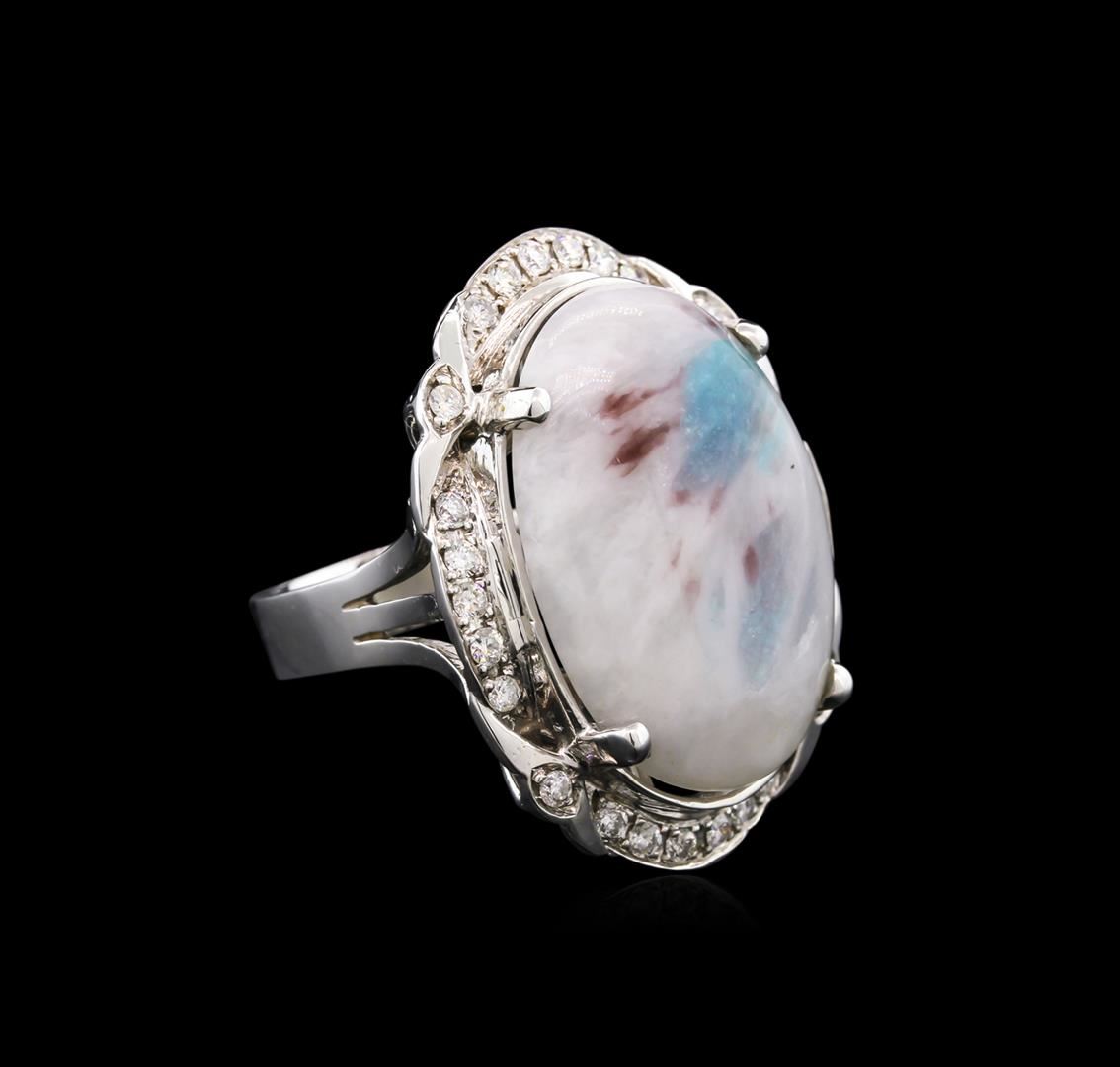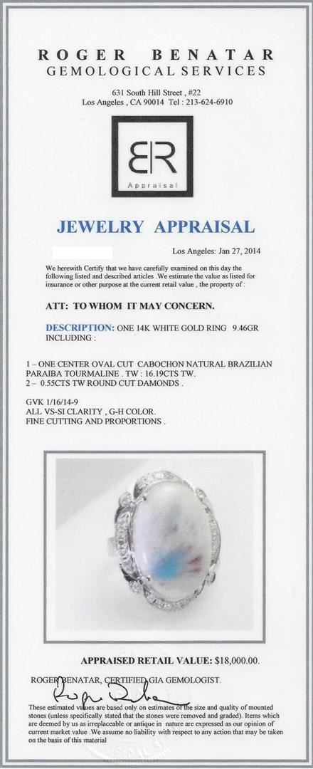 One 14K white gold ring 9.46gr including: 1- One center oval cut cabochon natural Brazilian Paraiba tourmaline. TW: 16.19cts TW. 2- 0.55cts tw round cut diamonds. GVK 1/16/14-9 All VS-SI Clarity, G-H color. Fine cutting and proportions. RBGS Appraised at $18,000.00.