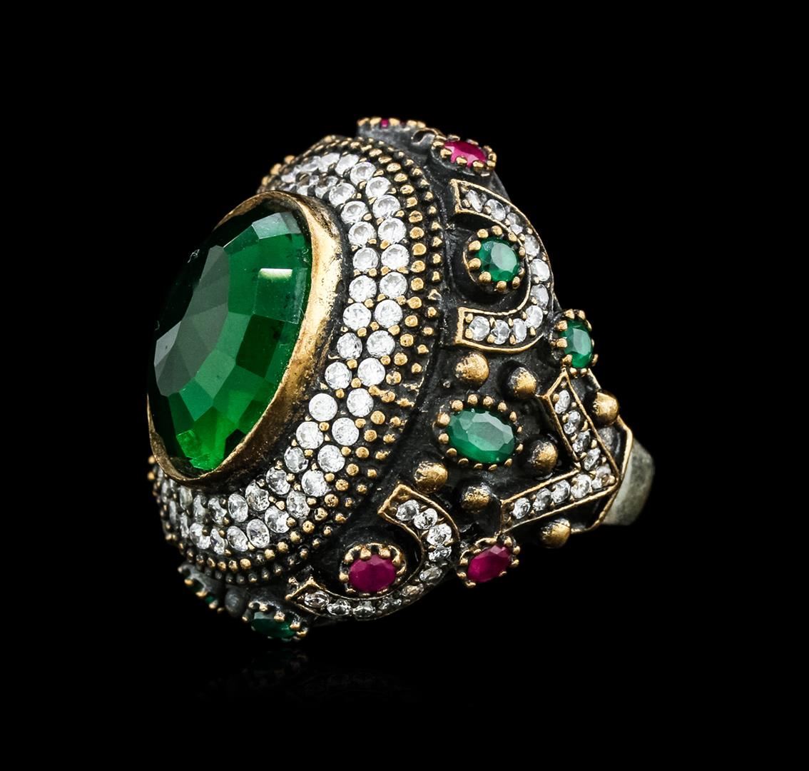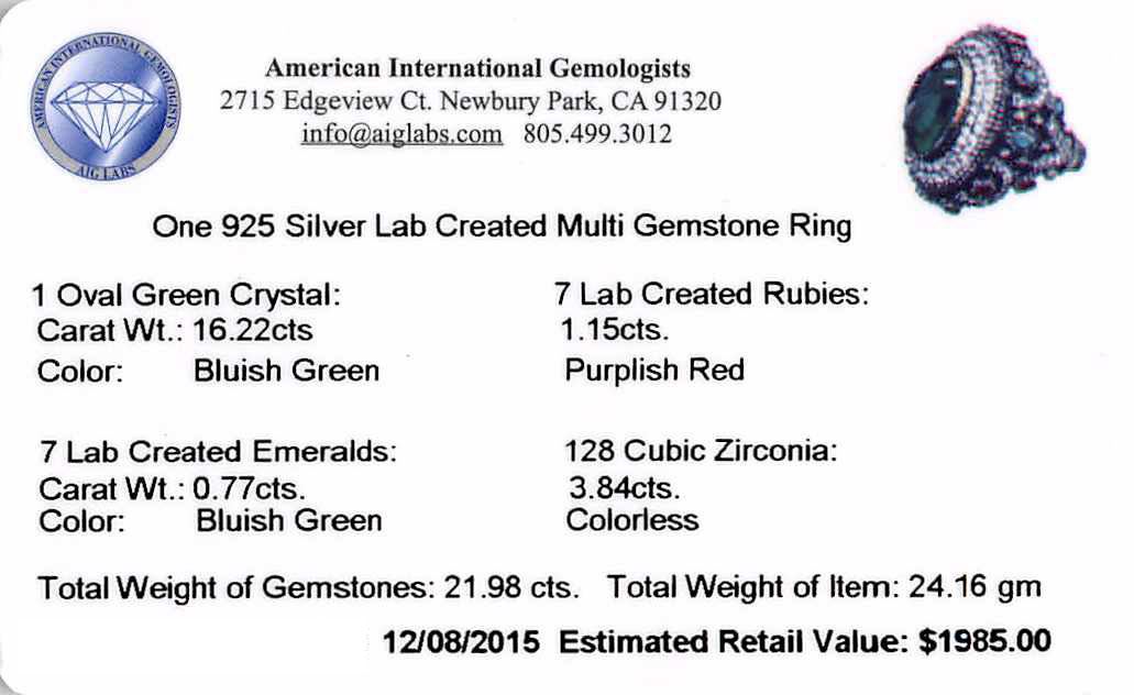 One 16.22ct Green Crystal and Multi Gemstone Ring - 925 SILVER. The featured lab created green crystal is set within tiered lab created cubic zirconia bezels supported by tapering lab created ruby, lab created emerald and lab created cubic zirconia set shoulders, completed by a four and one-half millimeter wide band. Bright and anodized finish. Identified with markings of "925". Condition is new, good workmanship. Containing: One bezel set oval mixed cut laboratory created green crystal, measuring 18.50 x 12.00 x 6.00mm, approximate weight of 16.22ct., clarity is eye clean, dark, moderately strong, very slightly bluish green color, (GIA vslbG 7/4), cut is good. One bezel set oval mixed cut laboratory created ruby, measuring 5.00 x 3.00 x 1.95mm, approximate weight of 0.25ct., clarity is eye clean, type II, medium dark, very slightly brownish, slightly purplish red color, (GIA slpR 6/3), cut is good. Six bezel set round mixed cut laboratory created rubies, measuring 3.10 - 3.00 x 1.98 mm, approximate total weight of 0.90ct., clarity is eye clean, type II, medium dark, very slightly brownish, slightly purplish red color, (GIA slpR 6/3), cut is good. One bezel set oval mixed cut laboratory created emerald, measuring 5.00 x 3.00 x 1.95mm, approximate weight of 0.17ct., clarity is eye clean, type III, dark, very slightly grayish, very slightly bluish green color, (GIA vslbG 7/3), cut is good. Six bezel set round mixed cut laboratory created emeralds, measuring 3.10 - 3.00 x 1.98 mm, approximate total weight of 0.60ct., clarity is eye clean, type III, dark, very slightly grayish, very slightly bluish green color, (GIA vslbG 7/3), cut is good. One hundred twenty-eight bead set round brilliant cut laboratory created cubic zirconias, measuring 1.70 - 1.50 x 1.04 mm, approximate total weight of 3.84ct., clarity is eye clean, colorless, very slightly grayish, white color, (GIA W 0/3), cut is good. Total Weight of Colored Stones 21.98ct. Total Weight of Ring 24.16gm. AIG Appraised at $1,985.00.