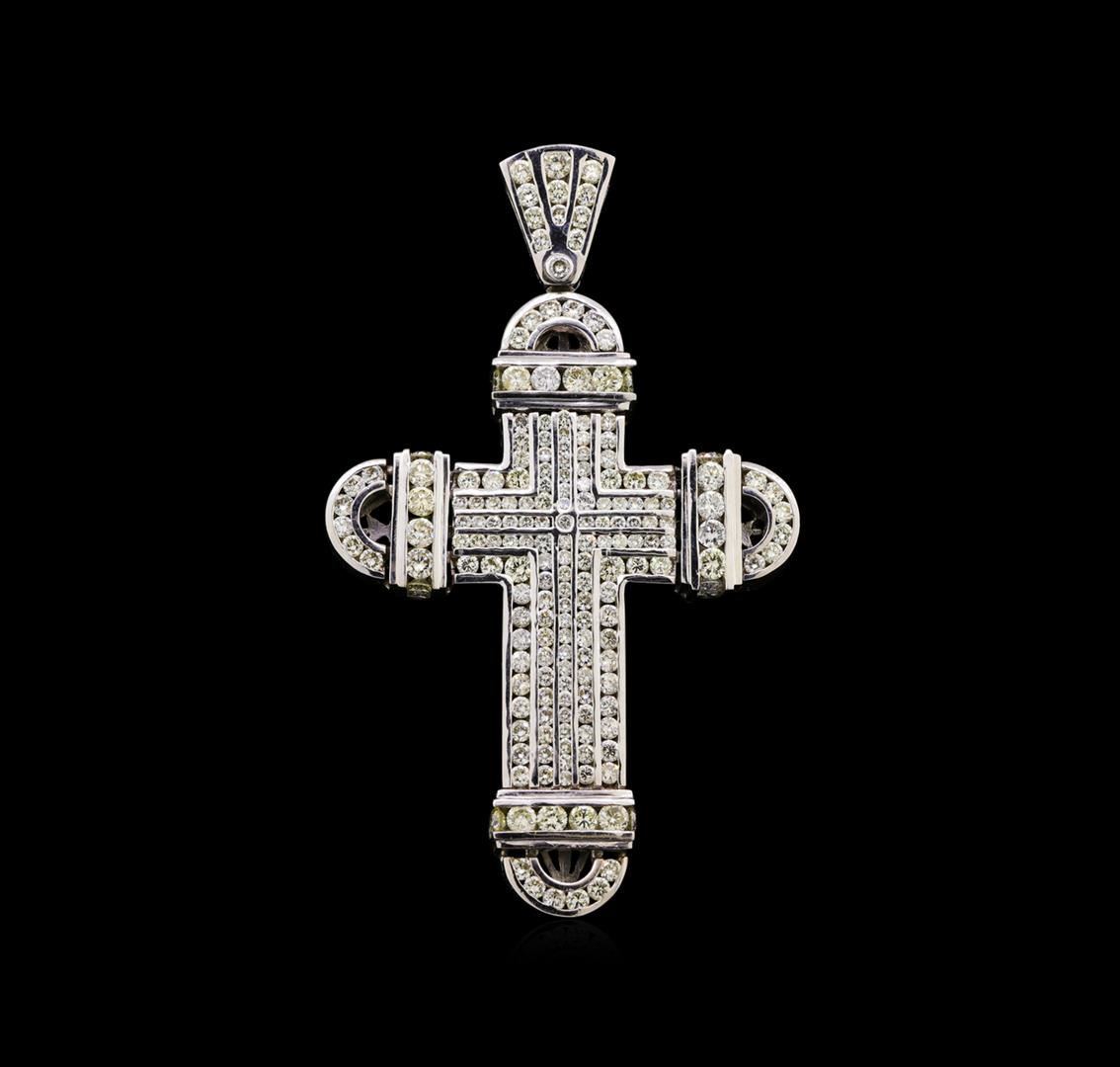 One electronically tested 10KT white gold cast & assembled diamond cross pendant with a bright polish finish. The pendant features an elaborate diamond encrusted cross design supported by a lattice under gallery, completed by a diamond set bail. Area measurements 3.75 x 2.25 inch. Condition is good. Containing: Thirty-Five channel set round brilliant cut diamonds, measuring 3.80 - 3.70 x 2.25mm (depth est.) approximate total weight of 35 Stones = 6.85ct. The color grade reflects the entire range of color for this group. Graded in the setting. Clarity: SI-2 to I-1 . Color: I - L Seventy-Three channel set round brilliant cut diamonds, measuring 3.00. - 2.70 x 1.71mm (depth est.) approximate total weight of 73 Stones = 6.24ct. Graded in the setting. Clarity: SI-2 to I-1 . Color: H - J Ninety channel set round brilliant cut diamonds, measuring 2.30 - 1.90 x 1.26mm (depth est.) approximate total weight of 90 Stones = 3.15ct. Graded in the setting. Clarity: SI-2 to I-1 . Color: H - J. Total Weight of Diamonds 16.24ct.. Total Weight of Pendant 74.13gm. AIG Appraised at $53,485.00.