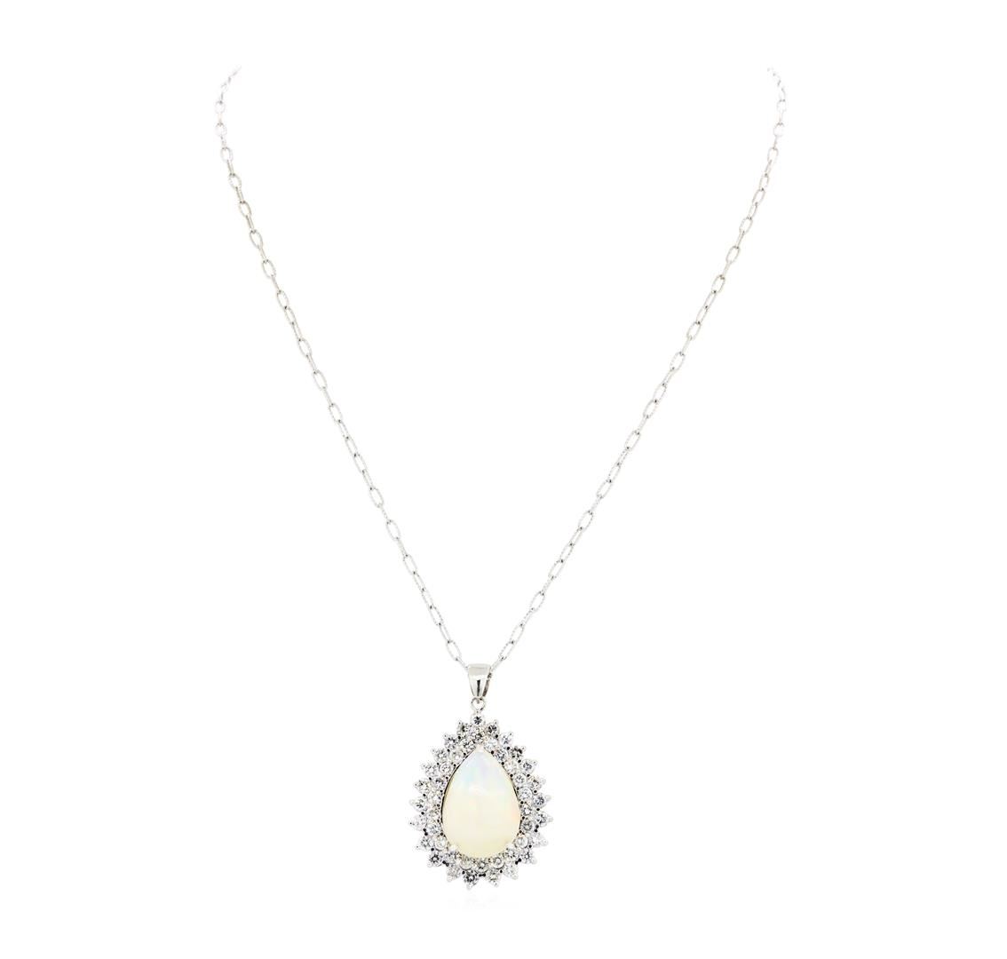 One electronically tested 14KT white gold lady's combination cast & assembled fashion pendant & chain 19.0' long, 2.5mm twisted oval shape link with a lobster claw clasp with a double basket halo with a bright polish finish. Identified with markings of '14K'. Condition is new, good workmanship. Containing: One crystal opal that is cut in a pear shaped cabochon and is prong set, measuring 22.50 mm long x 15.70 mm wide, and 11.52 mm thick and the approximate weight is 16.34 carats. The opal has a bright, multicolor play of color (fire) in a rolling flashfire pattern; a high dome; a good cut; slightly included; major dull spot in its brightness and pattern; and is not directional. Colored gemstones are presumed to have been subjected to commonly used enhancement processes. Graded in the setting. Forty-Five prong set round brilliant cut diamonds, measuring 3.00 - 2.90 x 1.83mm (depth est.) approximate total weight of 45 Stones = 4.50 ct. Graded in the setting. Color H - I Clarity SI-1 to I-1 Cut Good. Total Weight of Diamonds 4.50 ct.. Total Weight of Opals 16.34ct.. Total Weight of Pendant & Chain 16.30gm GAS Appraised at $14155.00. GAS Appraised.