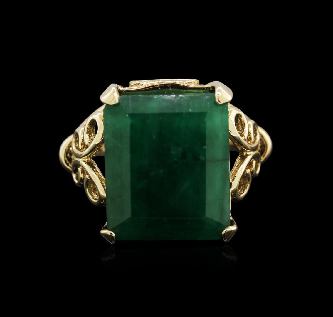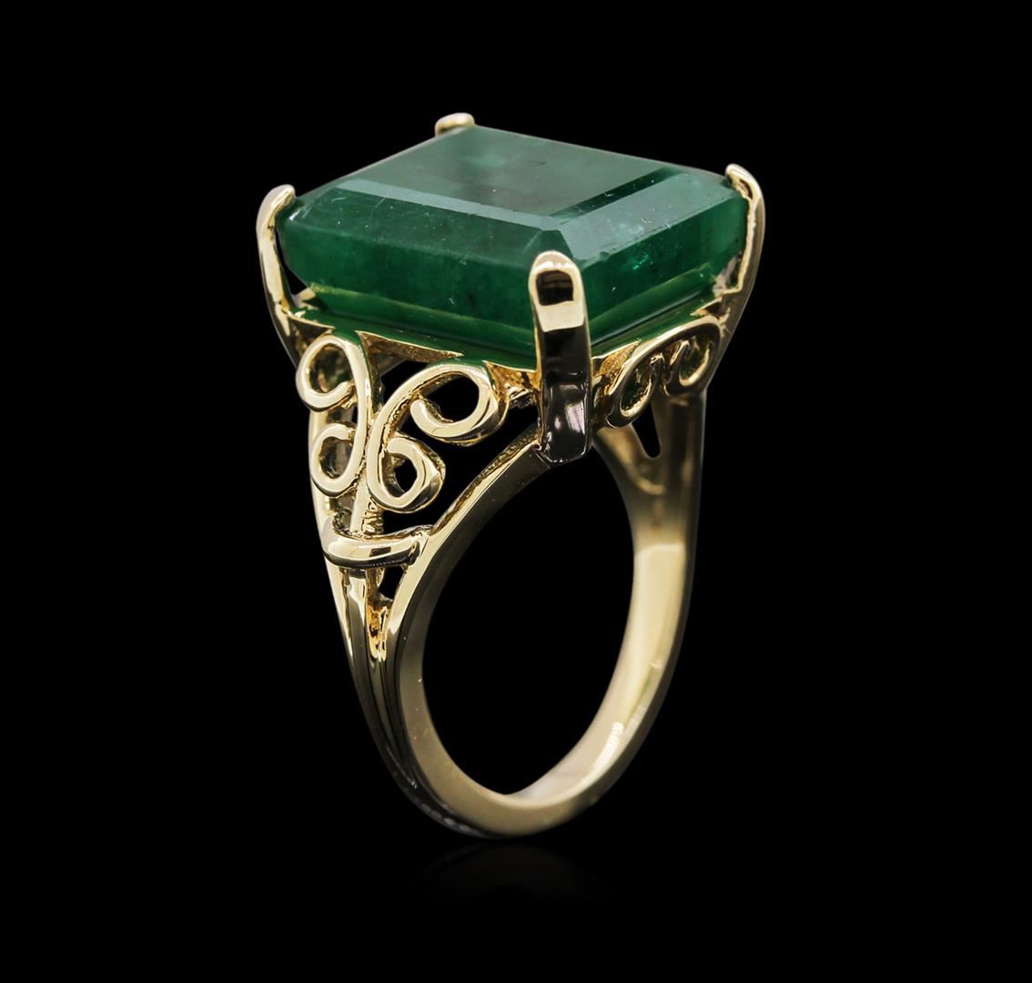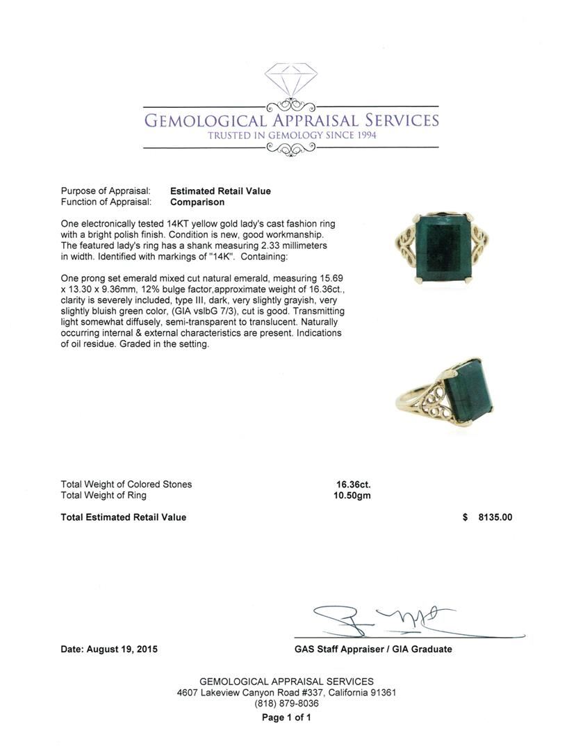 One electronically tested 14KT yellow gold lady's cast fashion ring with a bright polish finish. The featured lady's ring has a shank measuring 2.33 millimeters in width. Identified with markings of "14K". Condition is new, good workmanship. Containing: One prong set emerald mixed cut natural emerald, measuring 15.69 x 13.30 x 9.36mm, 12% bulge factor, approximate weight of 16.36ct., clarity is severely included, type III, dark, very slightly grayish, very slightly bluish green color, (GIA vslbG 7/3), cut is good. Transmitting light somewhat diffusely, semi-transparent to translucent. Naturally occurring internal & external characteristics are present. Indications of oil residue. Graded in the setting. Total Weight of Colored Stones 16.36ct. Total Weight of Ring 10.50gm. GAS Appraised at $8,135.00.