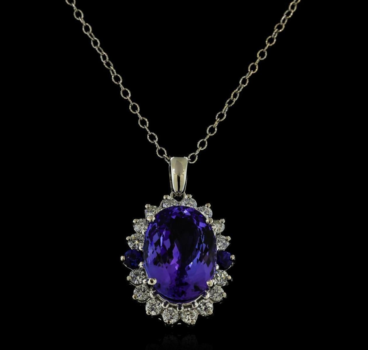 One electronically tested 14KT white gold lady's combination cast & assembled fashion pendant & chain 18.0' long, 2mm twisted oval cable link with a lobster claw clasp with a basket halo with a bright polish finish. Identified with markings of '14K'. Condition is new, good workmanship. Containing: One prong set oval modified brilliant cut natural tanzanite, measuring 19.01 x 13.87 x 8.27mm, (depth est.) 7%. bulge factor, approximate weight of 16.40ct., clarity is eye clean, medium, very slightly grayish, bluish violet color, (GIA bV 5/3), cut is very good. Transmitting light with no distortion, transparent. Colored gemstones are presumed to have been subjected to commonly used enhancement processes. Graded in the setting. Two prong set round modified brilliant cut natural blue sapphires, measuring 3.80 - 3.70 x 2.44 mm, (depth est.) approximate total weight of 0.47ct., clarity is eye clean, medium dark, strong, blue color, (GIA B 6/5), cut is very good. Transmitting light with no distortion, transparent. Colored gemstones are presumed to have been subjected to commonly used enhancement processes. Graded in the setting. Sixteen prong set round brilliant cut diamonds, measuring 3.10 - 3.00 x 1.89mm (depth est.) approximate total weight of 16 Stones = 1.70ct. Graded in the setting. Clarity SI-1 to I-1. Color: G - I Cut Good. Total Weight of Colored Stones 16.87ct.. Total Weight of Diamonds 1.70ct.. Total Weight of Pendant & Chain 15.00gm. GAS Appraised.