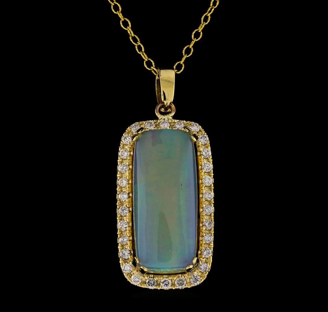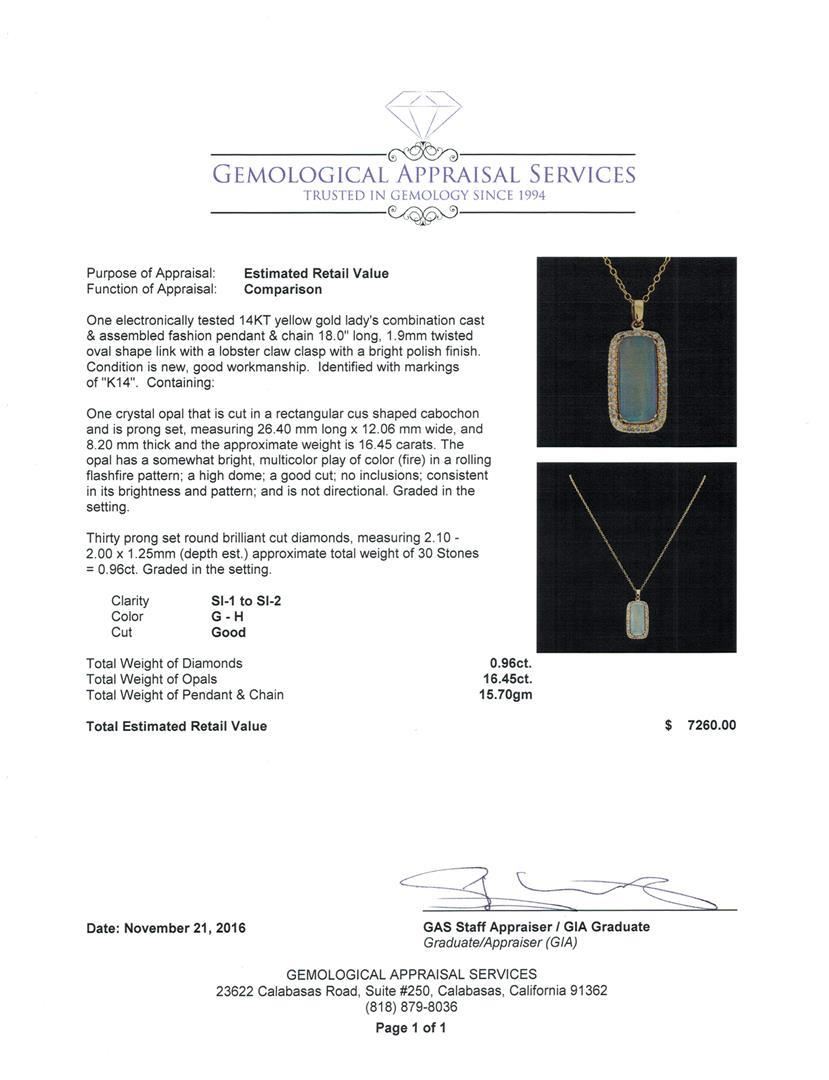 One electronically tested 14KT yellow gold lady's combination cast & assembled fashion pendant & chain 18.0' long, 1.9mm twisted oval shape link with a lobster claw clasp with a bright polish finish. Identified with markings of 'K14'. Condition is new, good workmanship. Containing: One crystal opal that is cut in a rectangular cus shaped cabochon and is prong set, measuring 26.40 mm long x 12.06 mm wide, and 8.20 mm thick and the approximate weight is 16.45 carats. The opal has a somewhat bright, multicolor play of color (fire) in a rolling flashfire pattern; a high dome; a good cut; no inclusions; consistent in its brightness and pattern; and is not directional. Graded in the setting. Thirty prong set round brilliant cut diamonds, measuring 2.10 - 2.00 x 1.25mm (depth est.) approximate total weight of 30 Stones = 0.96ct. Graded in the setting. Clarity SI-1 to SI-2. Color: G - H Cut Good. Total Weight of Diamonds 0.96ct.. Total Weight of Opals 16.45ct.. Total Weight of Pendant & Chain 15.70gm. GAS Appraised.