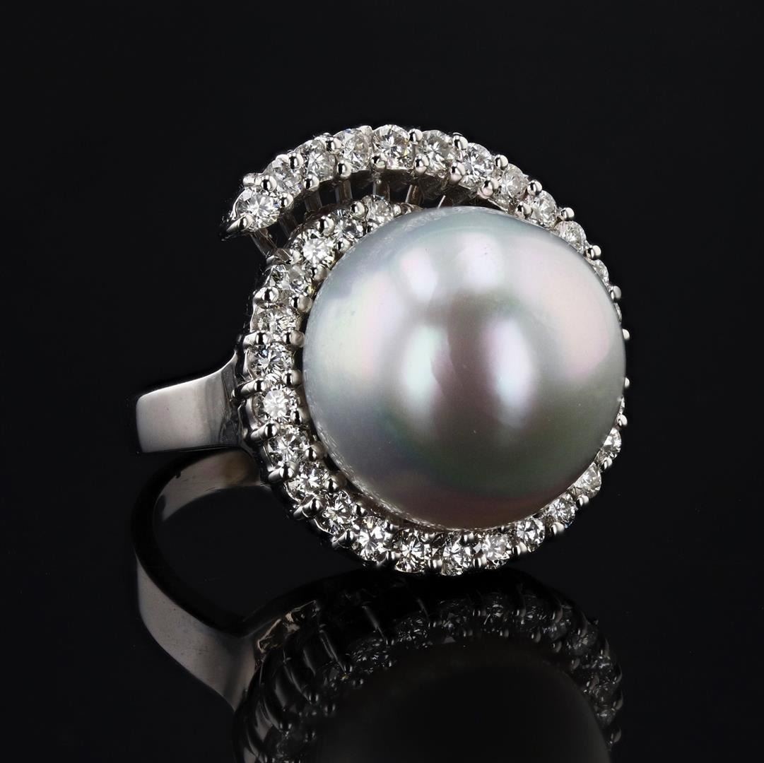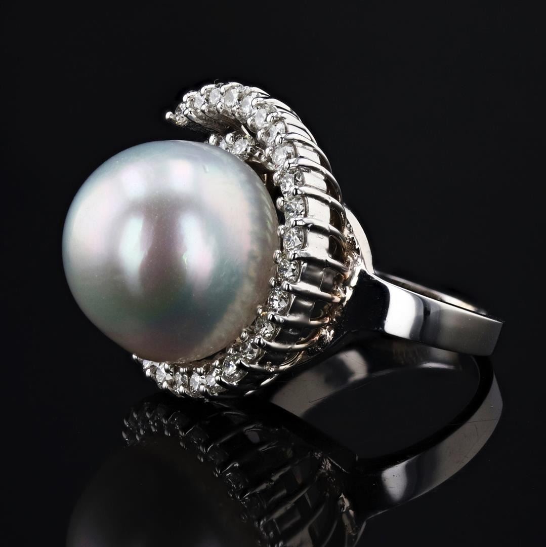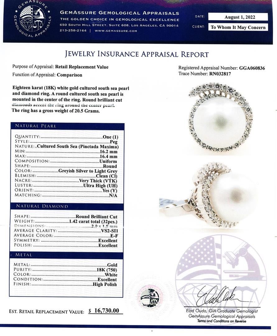 Eighteen karat (18K) white gold cultured south sea pearl and diamond ring. A round cultured south sea pearl is mounted in the center of the ring. Round brilliant cut diamonds accent the ring around the center pearl. The ring has a gross weight of 20.5 Gra