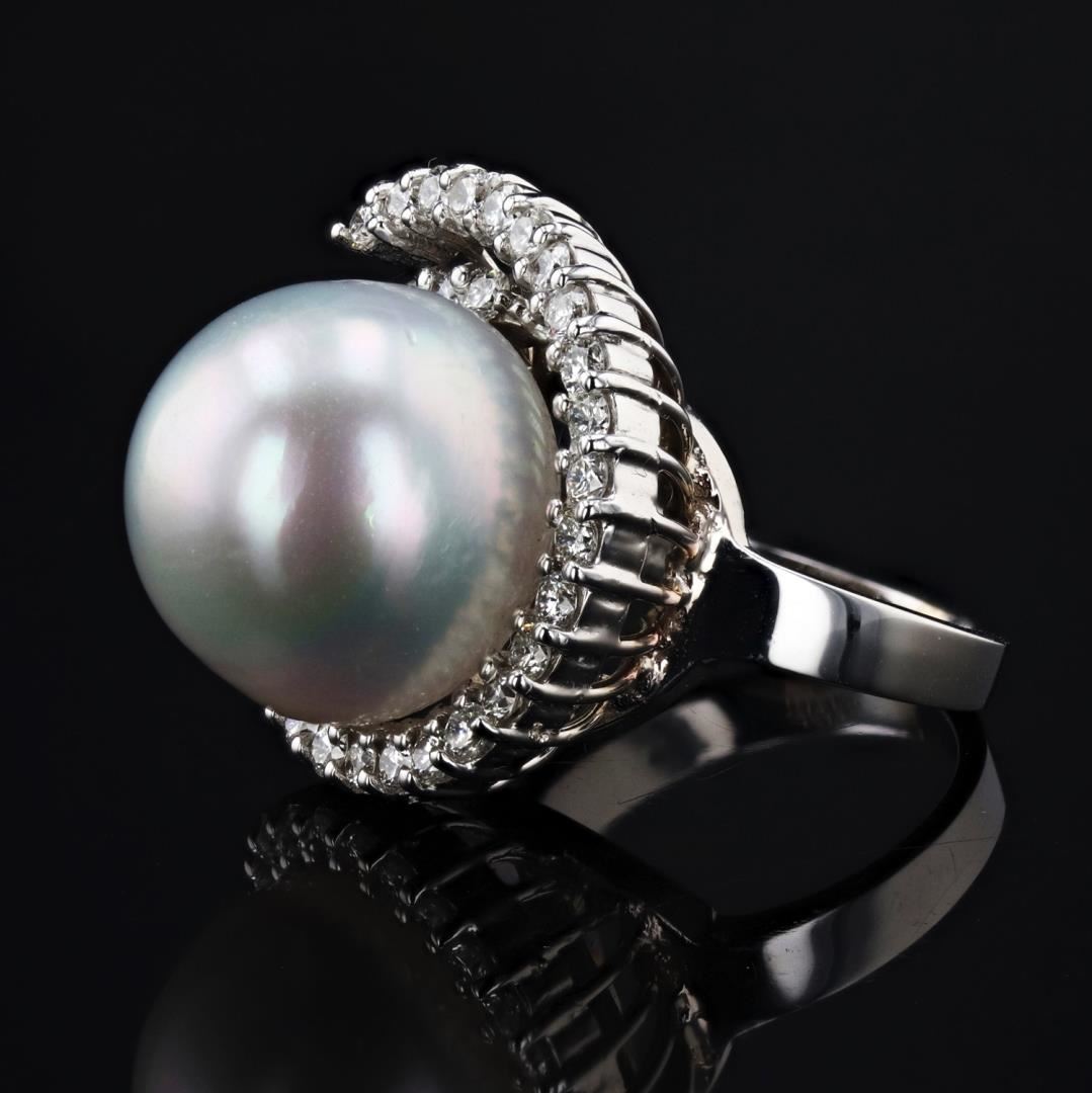 Eighteen karat (18K) white gold cultured south sea pearl and diamond ring. A round cultured south sea pearl is mounted in the center of the ring. Round brilliant cut diamonds accent the ring around the center pearl. The ring has a gross weight of 20.5 Grams. NATURAL PEARL QUANTITY: 0ne (1) NATURE: Cultured South Sea (Pinctada Maxima) MIN: 16.2mm MAX: 16.4mm COMPOSITIONI: Uniform SHAPE:. Round COLOR: Greyish Silver to Light Grey BLEMISH: Clean (CI) NACRE: Very Thick (VTK) LUSTER: Ultra High (UH) ORIENT: .Yes (Y) MATCHING: .N/A NATURAL DIAMOND SHAPE: Round Brilliant Cut WEIGHT: 1.42 carat total (32pcs.) DIMENSIONS: 2.0 x 1.8mm AVERAGE CLARITY: VS2 to SI1 AVERAGE COLOR: E - F SYMMETRY: Excellent POLISH: Excellent METAL METAL: Gold PURITY: 18K (750) COLOR: White CONDITION: Excellent FINISH: High Polish Size: 7