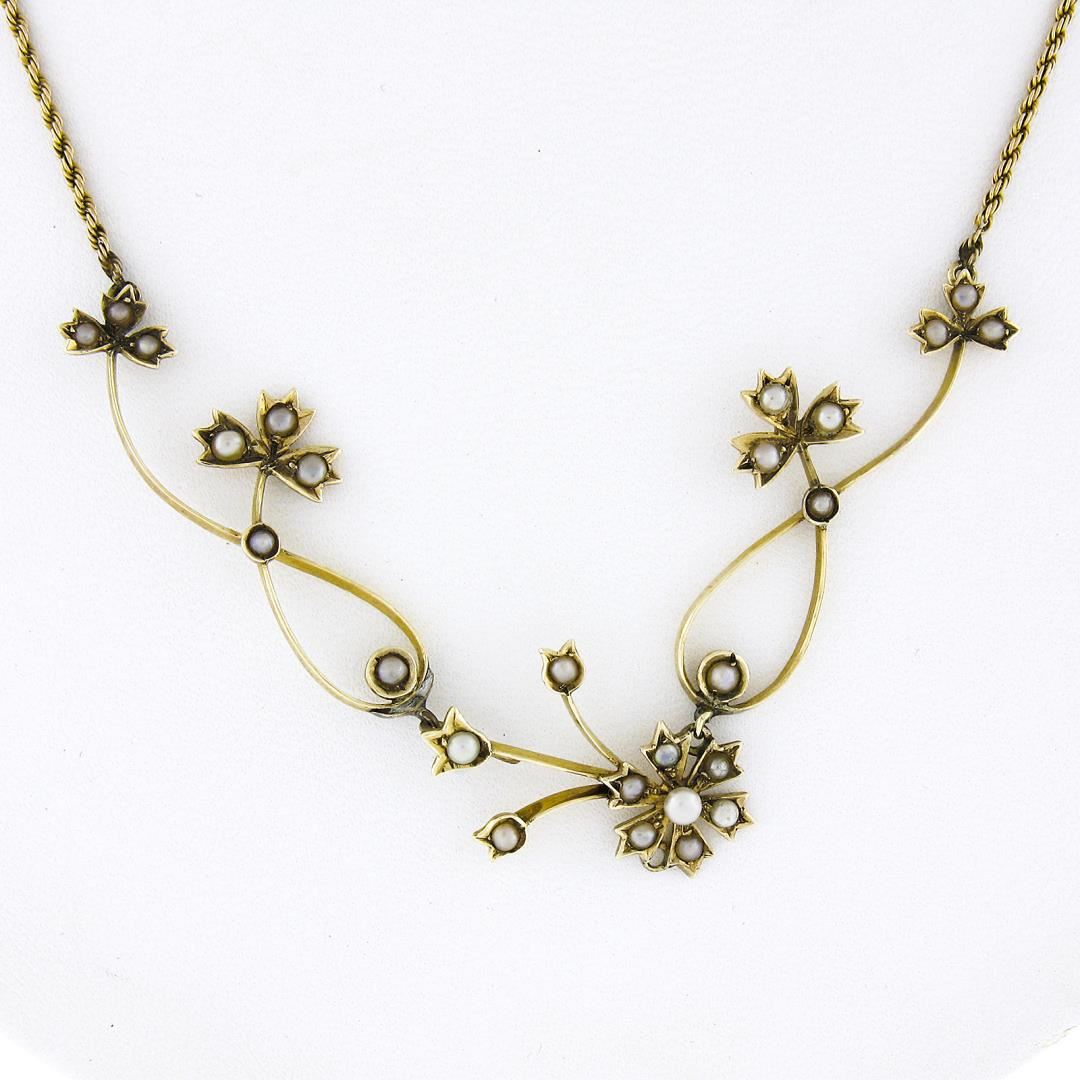 An antique solid 14k yellow gold clover necklace, with 26 round shape cultured seed pearls (1.7mm to 2.7mm each). It weighs a total of 6.36 grams, measures 81.20mm wide, and measures 16.5 inches in length.
