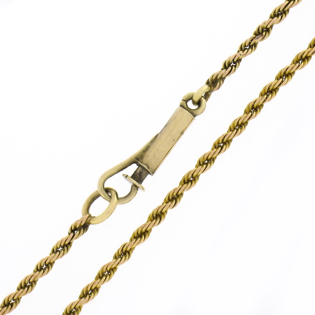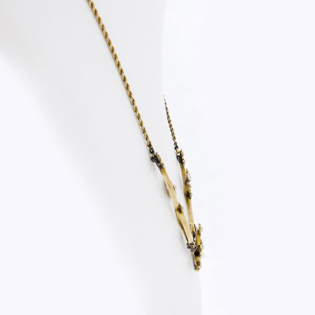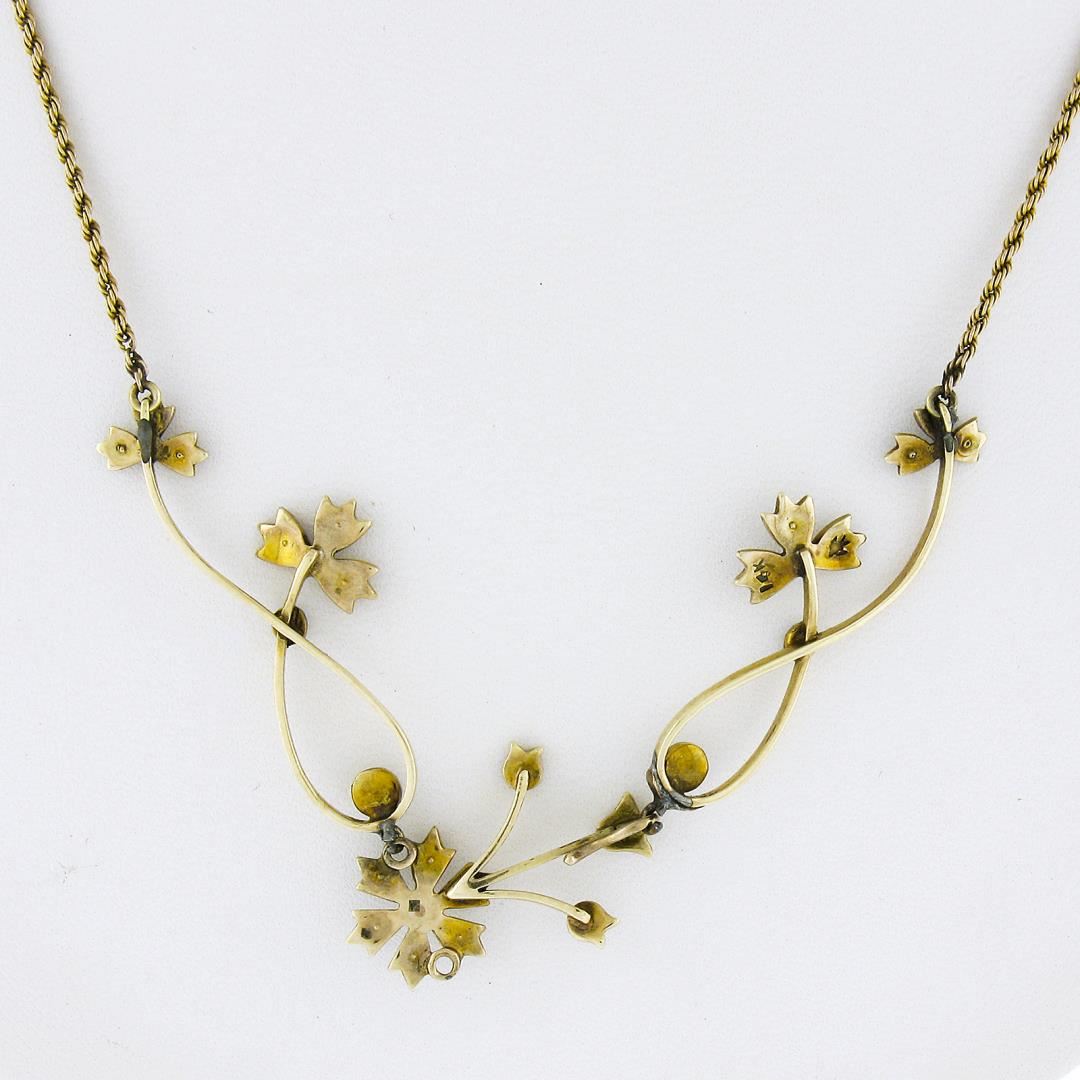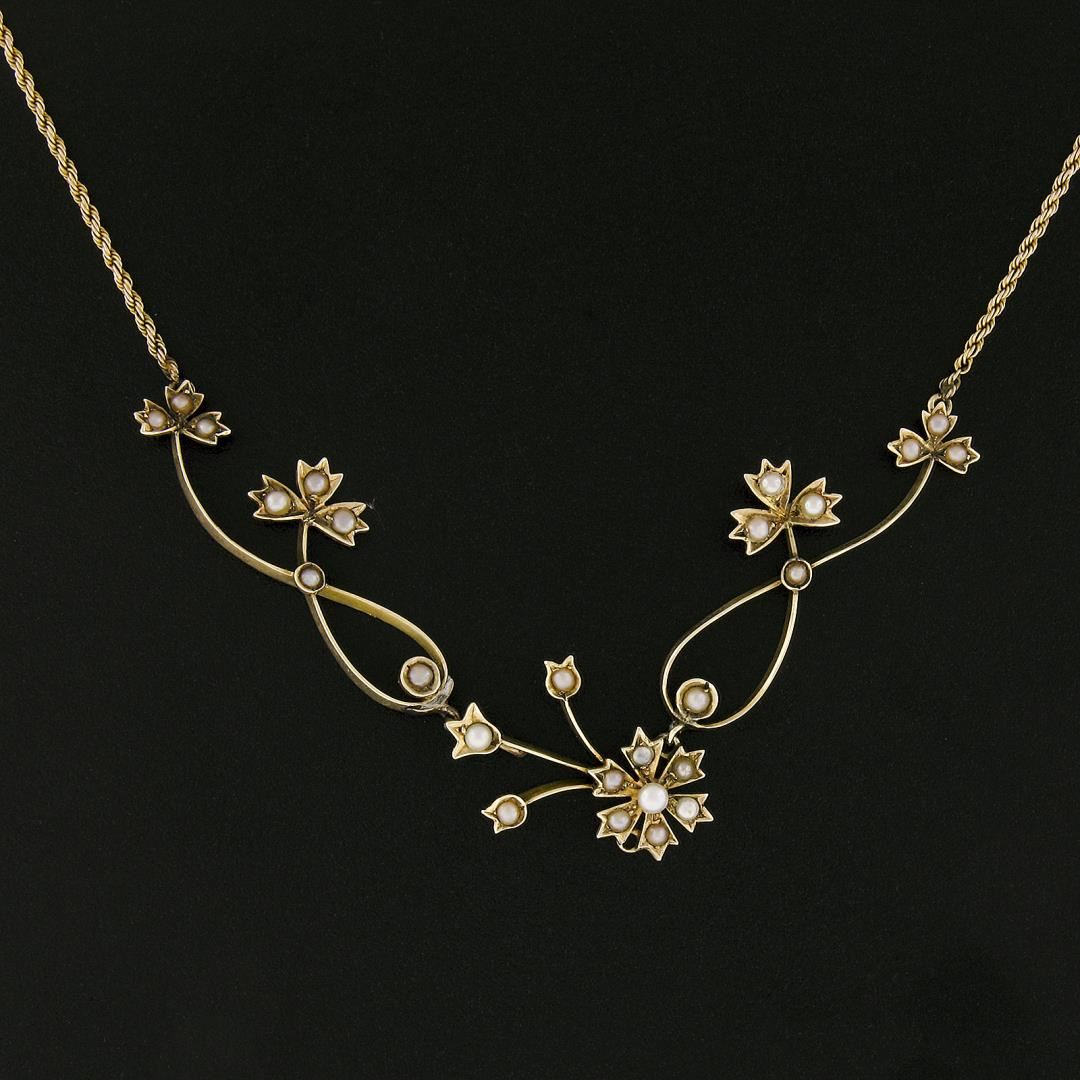 An antique solid 14k yellow gold clover necklace, with 26 round shape cultured seed pearls (1.7mm to 2.7mm each). It weighs a total of 6.36 grams, measures 81.20mm wide, and measures 16.5 inches in length.