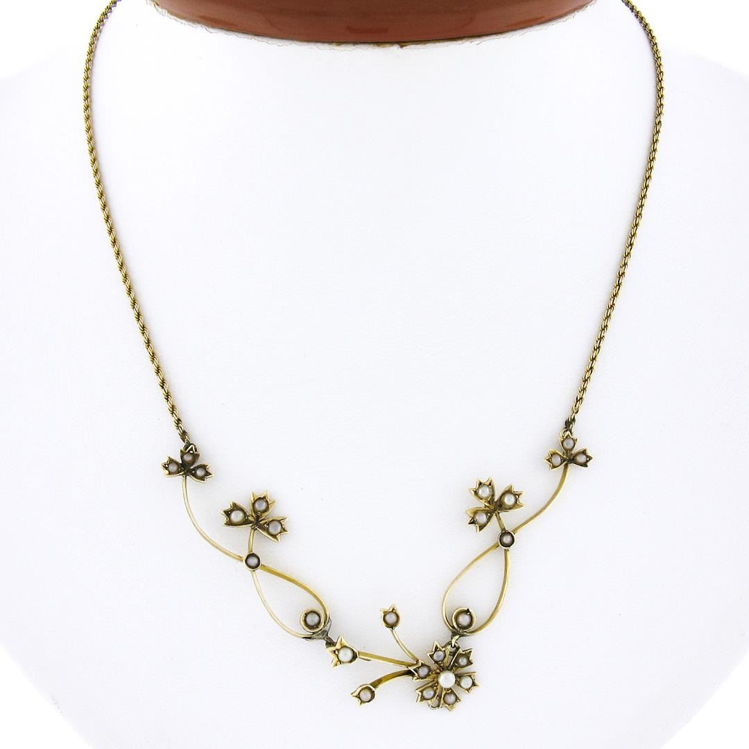 An antique solid 14k yellow gold clover necklace, with 26 round shape cultured seed pearls (1.7mm to 2.7mm each). It weighs a total of 6.36 grams, measures 81.20mm wide, and measures 16.5 inches in length.