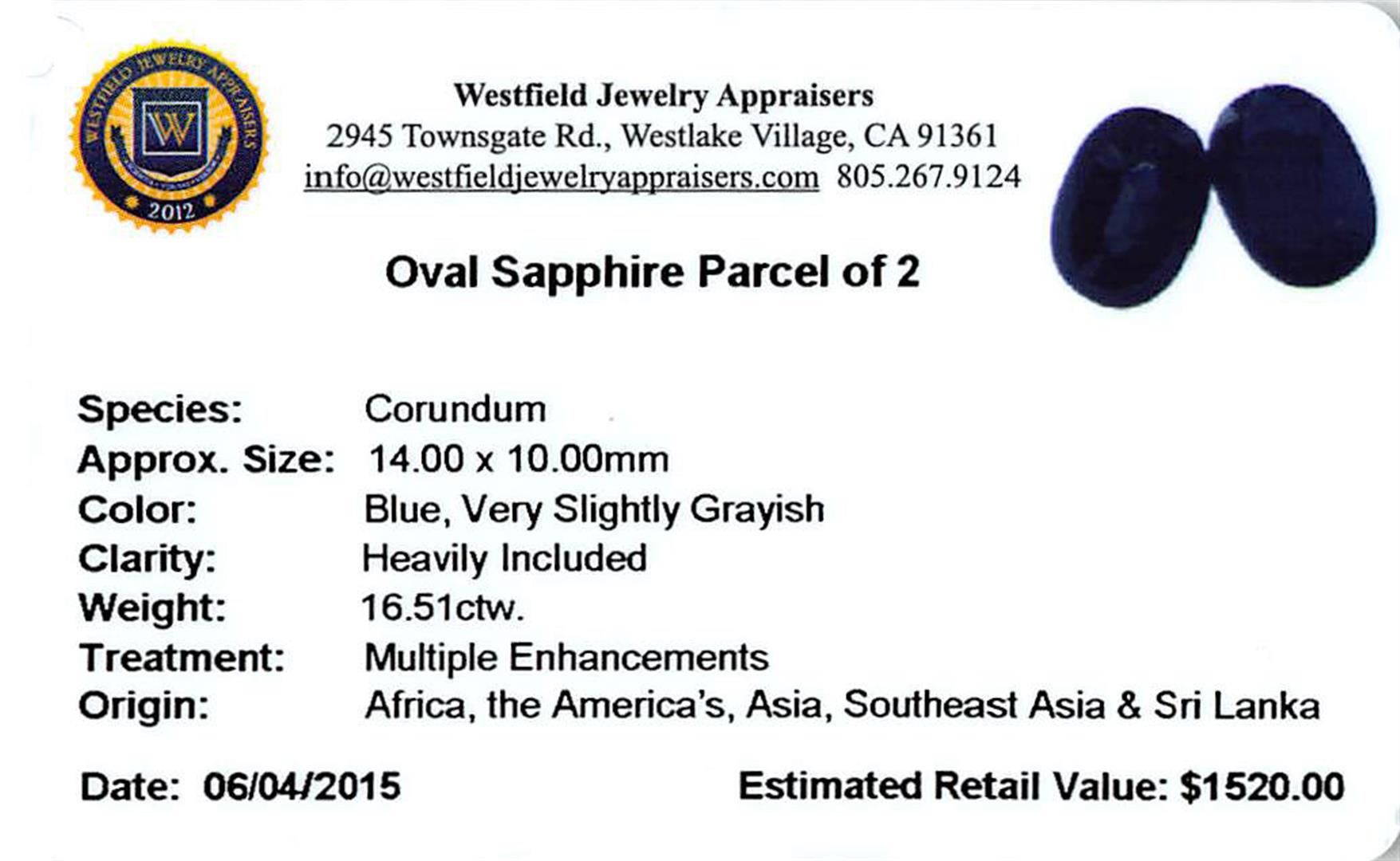 Two oval mixed cut natural blue sapphires, measuring 14.00 x 10.00 x 6.50mm, exact total weight 16.51ct., clarity is heavily included, type II, very dark, very slightly grayish, blue color, (GIA B 8/3), cut is good. Measurements are an average for the group. Transmitting light very diffusely, opaque, Naturally occurring internal & external characteristics are present, Indications of multiple laboratory enhancements, including high temperature heat treatment. Westfield Appraised at $1,520.00.