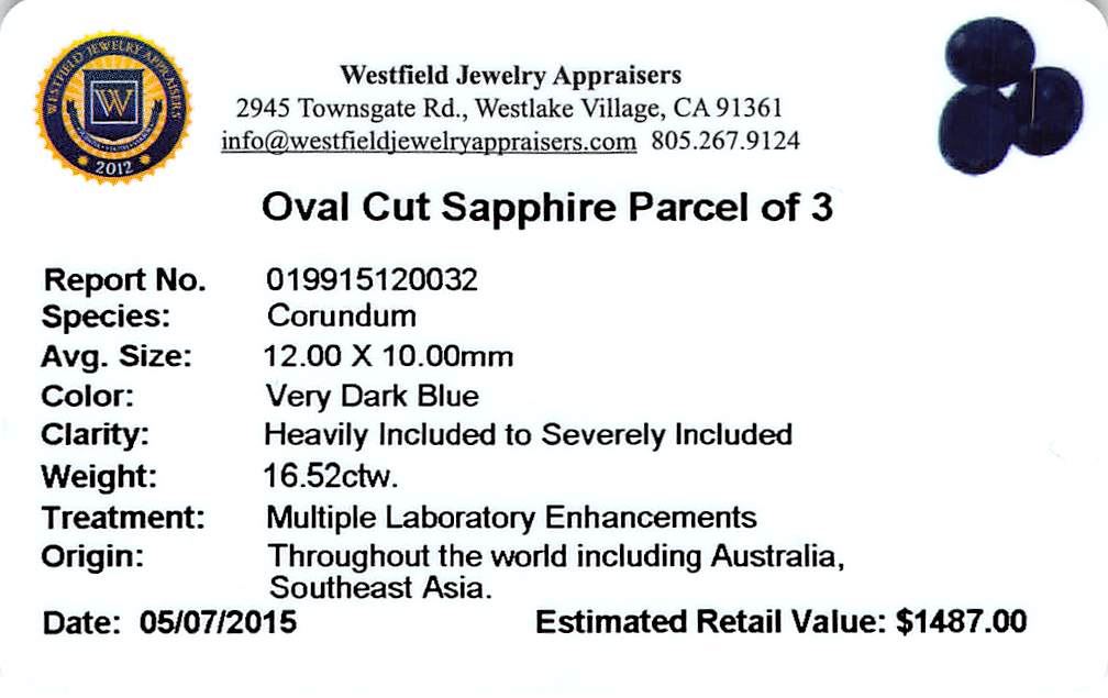 Three oval cut sapphires, measuring 12.00 x 10.00mm, approximate total weight of 16.52ct., clarity is heavily included to severely included, very dark blue color. Indications of multiple laboratory enhancements. Westfield Appraised at $1,487.00.