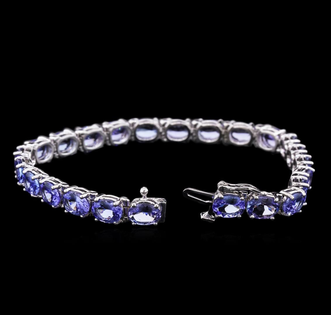 One electronically tested 14KT white gold lady's combination cast & assembled straight line bracelet with a tongue clasp with foldover safety with a bright polish finish. The featured lady's bracelet measures approximately 7.25 inches in length. Identified with markings of "14K". Condition is new, good workmanship. Containing: Twenty-four prong set oval modified brilliant cut natural tanzanites, measuring 7.00 x 4.90 x 2.90mm, approximate total weight of 16.60ct., clarity is eye clean, type I, medium light, very slightly grayish, bluish violet color, (GIA bV 4/3), cut is good. Transmitting light with no distortion, transparent. Colored gemstones are presumed to have been subjected to commonly used enhancement processes. Graded in the setting. Total Weight of Colored Stones 16.60ct. Total Weight of Bracelet 16.60gm. GAS Appraised.