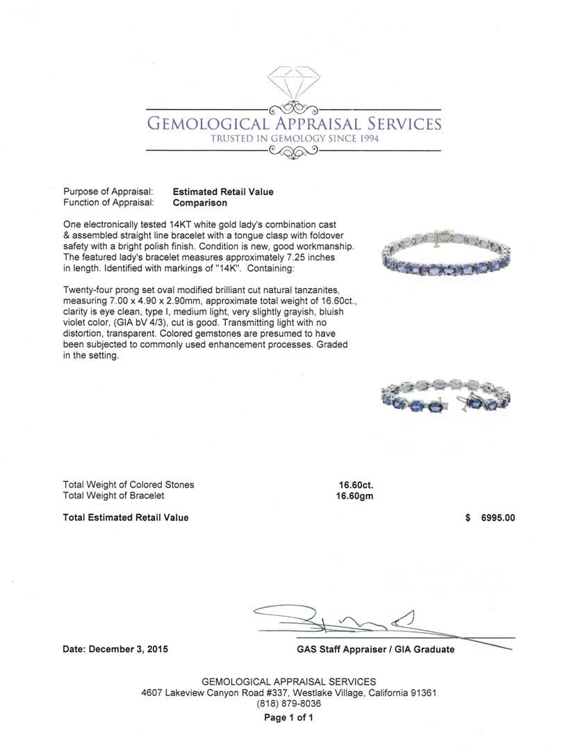 One electronically tested 14KT white gold lady's combination cast & assembled straight line bracelet with a tongue clasp with foldover safety with a bright polish finish. The featured lady's bracelet measures approximately 7.25 inches in length. Identified with markings of "14K". Condition is new, good workmanship. Containing: Twenty-four prong set oval modified brilliant cut natural tanzanites, measuring 7.00 x 4.90 x 2.90mm, approximate total weight of 16.60ct., clarity is eye clean, type I, medium light, very slightly grayish, bluish violet color, (GIA bV 4/3), cut is good. Transmitting light with no distortion, transparent. Colored gemstones are presumed to have been subjected to commonly used enhancement processes. Graded in the setting. Total Weight of Colored Stones 16.60ct. Total Weight of Bracelet 16.60gm. GAS Appraised.