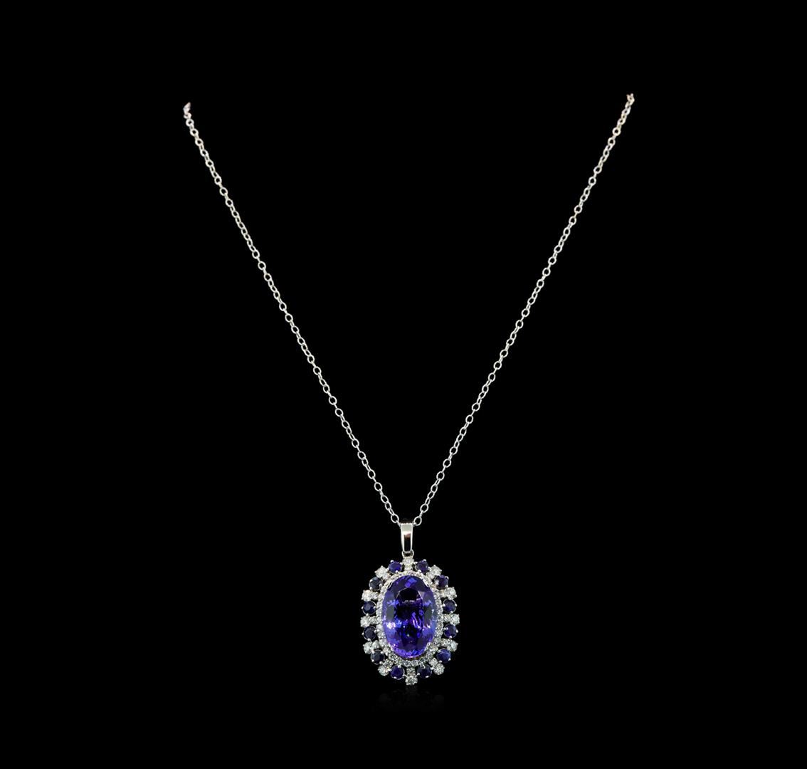 One electronically tested 14KT white gold lady's combination cast & assembled fashion pendant & chain 18.0' long, 2mm twisted oval cable link with a lobster claw clasp with a double basket halo with a bright polish finish. Identified with markings of '14K'. Condition is new, good workmanship. Containing: One prong set oval modified brilliant cut natural tanzanite, measuring 19.68 x 13.08 x 8.98mm, (depth est.) 2%. bulge factor, approximate weight of 16.62ct., clarity is eye clean, medium, moderately strong, violet color, (GIA V 5/4), cut is very good. Transmitting light with no distortion, transparent. Colored gemstones are presumed to have been subjected to commonly used enhancement processes. Graded loose prior to setting in the GIA Laboratory, Report #2171668753. Twelve prong set round modified brilliant cut natural blue sapphires, measuring 3.00 - 2.95 x 1.95 mm, (depth est.) approximate total weight of 1.73ct., clarity is slightly included, medium, moderately strong, blue color, (GIA B 5/4), cut is good. Transmitting light with a minimum of distortion, transparent. Colored gemstones are presumed to have been subjected to commonly used enhancement processes. Graded in the setting. Twelve prong set round brilliant cut diamonds, measuring 2.50 - 2.45 x 1.54mm (depth est.) approximate total weight of 12 Stones = 0.69ct. Graded in the setting. Clarity SI-1 to I-1. Color: H - I Cut Good Forty-Two prong set round brilliant cut diamonds, measuring 1.75 - 1.65 x 1.04mm (depth est.) approximate total weight of 42 Stones = 0.77ct. Graded in the setting. Clarity SI-1 to I-1. Color: H - I Cut Good. Total Weight of Colored Stones 18.35ct.. Total Weight of Diamonds 1.46ct.. Total Weight of Pendant & Chain 13.00gm GAS Appraised at $27,920.00.