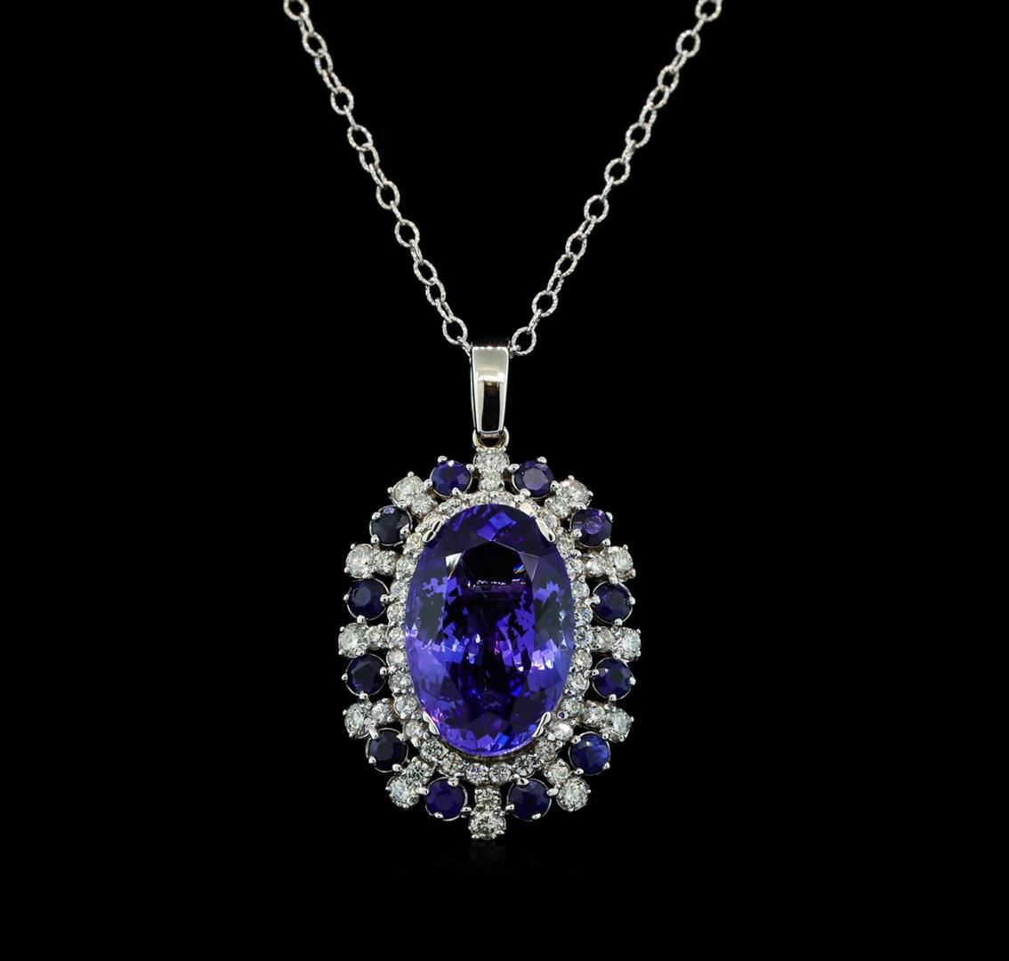 One electronically tested 14KT white gold lady's combination cast & assembled fashion pendant & chain 18.0' long, 2mm twisted oval cable link with a lobster claw clasp with a double basket halo with a bright polish finish. Identified with markings of '14K'. Condition is new, good workmanship. Containing: One prong set oval modified brilliant cut natural tanzanite, measuring 19.68 x 13.08 x 8.98mm, (depth est.) 2%. bulge factor, approximate weight of 16.62ct., clarity is eye clean, medium, moderately strong, violet color, (GIA V 5/4), cut is very good. Transmitting light with no distortion, transparent. Colored gemstones are presumed to have been subjected to commonly used enhancement processes. Graded loose prior to setting in the GIA Laboratory, Report #2171668753. Twelve prong set round modified brilliant cut natural blue sapphires, measuring 3.00 - 2.95 x 1.95 mm, (depth est.) approximate total weight of 1.73ct., clarity is slightly included, medium, moderately strong, blue color, (GIA B 5/4), cut is good. Transmitting light with a minimum of distortion, transparent. Colored gemstones are presumed to have been subjected to commonly used enhancement processes. Graded in the setting. Twelve prong set round brilliant cut diamonds, measuring 2.50 - 2.45 x 1.54mm (depth est.) approximate total weight of 12 Stones = 0.69ct. Graded in the setting. Clarity SI-1 to I-1. Color: H - I Cut Good Forty-Two prong set round brilliant cut diamonds, measuring 1.75 - 1.65 x 1.04mm (depth est.) approximate total weight of 42 Stones = 0.77ct. Graded in the setting. Clarity SI-1 to I-1. Color: H - I Cut Good. Total Weight of Colored Stones 18.35ct.. Total Weight of Diamonds 1.46ct.. Total Weight of Pendant & Chain 13.00gm GAS Appraised at $27,920.00.