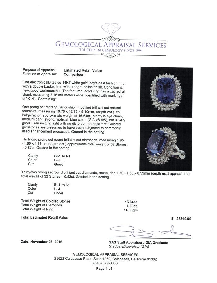 One electronically tested 14KT white gold lady's cast fashion ring with a double basket halo with a bright polish finish. The featured lady's ring has a cathedral shank measuring 3.15 millimeters wide. Identified with markings of 'K14'. Condition is new, good workmanship. Containing: One prong set rectangular cushion modified brilliant cut natural tanzanite, measuring 16.70 x 12.85 x 9.10mm, (depth est.) 8%. bulge factor, approximate weight of 16.64ct., clarity is eye clean, medium dark, strong, violetish blue color, (GIA vB 6/5), cut is very good. Transmitting light with no distortion, transparent. Colored gemstones are presumed to have been subjected to commonly used enhancement processes. Graded in the setting. Thirty-Two prong set round brilliant cut diamonds, measuring 1.95 - 1.85 x 1.18mm (depth est.) approximate total weight of 32 Stones = 0.87ct. Graded in the setting. Clarity SI-1 to I-1. Color: I - J Cut Good Thirty-Two prong set round brilliant cut diamonds, measuring 1.70 - 1.60 x 0.99mm (depth est.) approximate total weight of 32 Stones = 0.52ct. Graded in the setting. Clarity SI-1 to I-1. Color: I - J Cut Good. Total Weight of Colored Stones 16.64ct.. Total Weight of Diamonds 1.39ct.. Total Weight of Ring 14.00gm. GAS Appraised at $25,310.00.