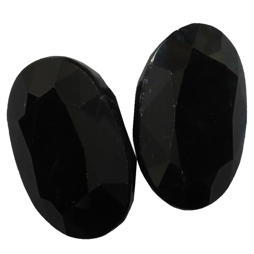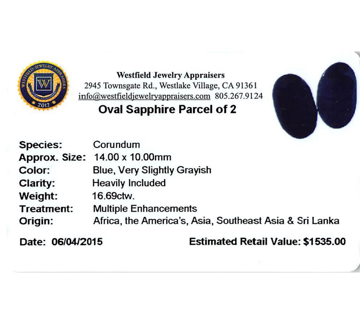 Two oval mixed cut natural blue sapphires, measuring 14.00 x 10.00 x 6.50mm, exact total weight 16.69ct., clarity is heavily included, type II, very dark, very slightly grayish, blue color, (GIA B 8/3), cut is good. Measurements are an average for the group. Transmitting light very diffusely, opaque, Naturally occurring internal & external characteristics are present, Indications of multiple laboratory enhancements, including high temperature heat treatment. Westfield Appraised at $1,535.00.