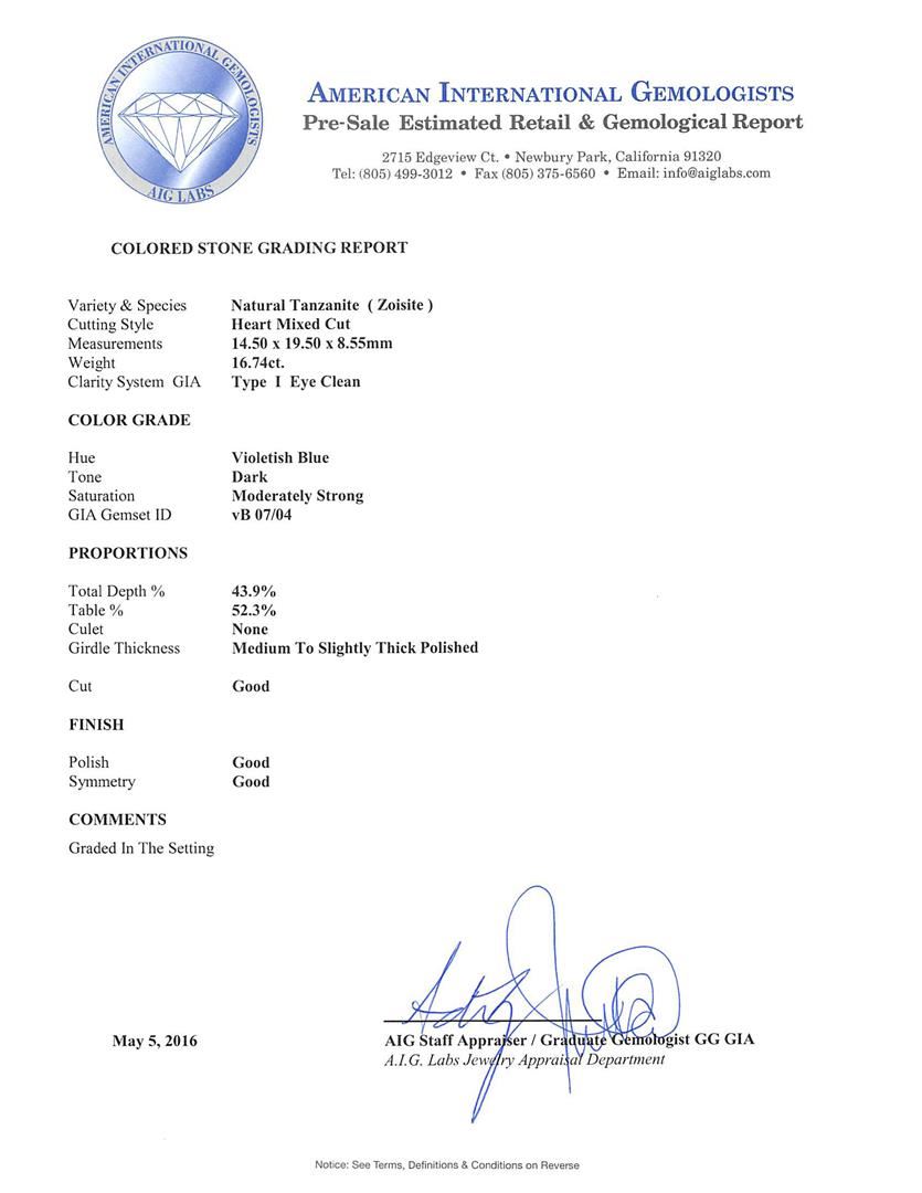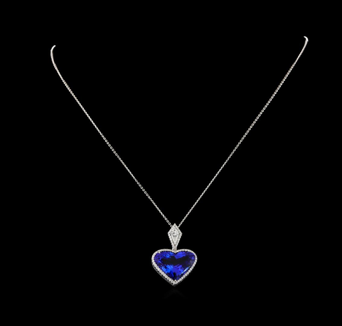 One electronically tested platinum ladies cast & assembled tanzanite and diamond pendant with chain. The pendant features a tanzanite set within a diamond bezel supported by an elaborate lattice under gallery, completed by a stylized diamond set bail. The pendant is supported by an eighteen inch length 14KT white gold link chain, terminating in a spring ring clasp. Bright polish finish with milgrain detailing throughout. Condition is new, good workmanship. Containing: One prong set heart mixed cut natural tanzanite, measuring 14.50 x 19.50 x 8.55mm, 6%. bulge factor, approximate weight of 16.74ct., clarity is eye clean, type I, dark, moderately strong, violetish blue color, (GIA vB 7/4), cut is good. Transmitting light with no distortion, transparent. Colored Stone Grading Report attached. Graded in the setting. Tanzanite is a very rare gemstone that is only found in the country of Tanzania. Originally discovered in 1967. Tiffany & Company, named the stone Tanzanite. It is found in the Usumburu Mountains that border the Umba Valley of northern Tanzania. Tanzanite occurs in gray, brown, violet, blue, reddish-purple, & green. The gem is interesting because of its exceptional pleochroism. Rotated in different directions a tanzanite will exhibit multiple changes of color. Tanzanite has a low tolerance to ultrasonic cleaning, and should not be cleaned using this method. One prong set Kite cut diamond, measuring 8.50 x 4.40 x 2.00mm (depth est.) approximate weight of 0.32ct. Graded in the setting. Clarity: SI-2. Color: F Seventy prong set round brilliant cut diamonds, measuring 1.00 - 0.90 x 0.57mm (depth est.) approximate total weight of 70 Stones = 0.30ct. Graded in the setting. Clarity: VS-1 to VS-2. Color: E - F. Total Weight of Colored Stones 16.74ct. Total Weight of Diamonds 0.62ct. Total Weight of Pendant With Chain 12.88gm. AIG Appraised at $45,615.00.