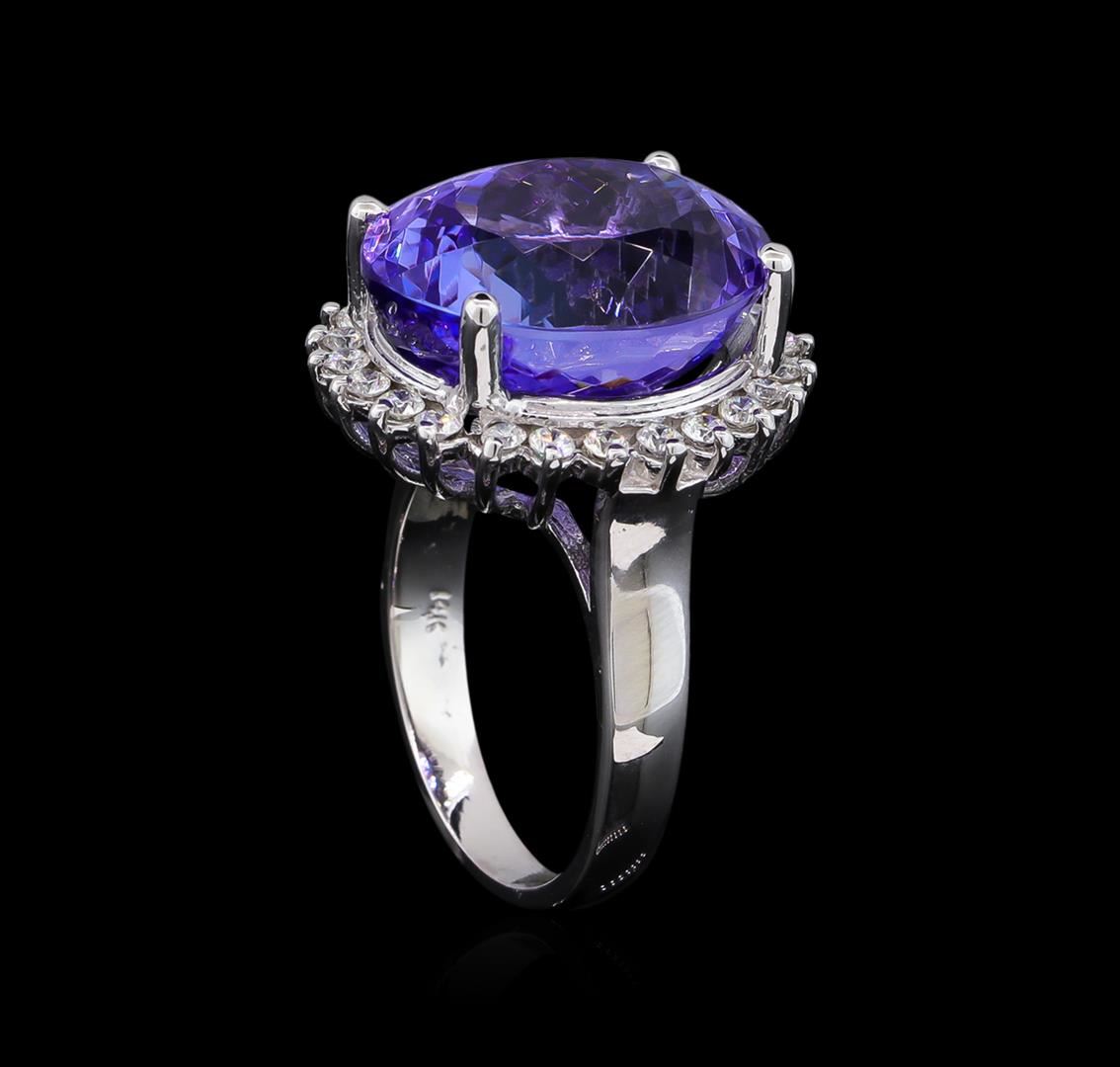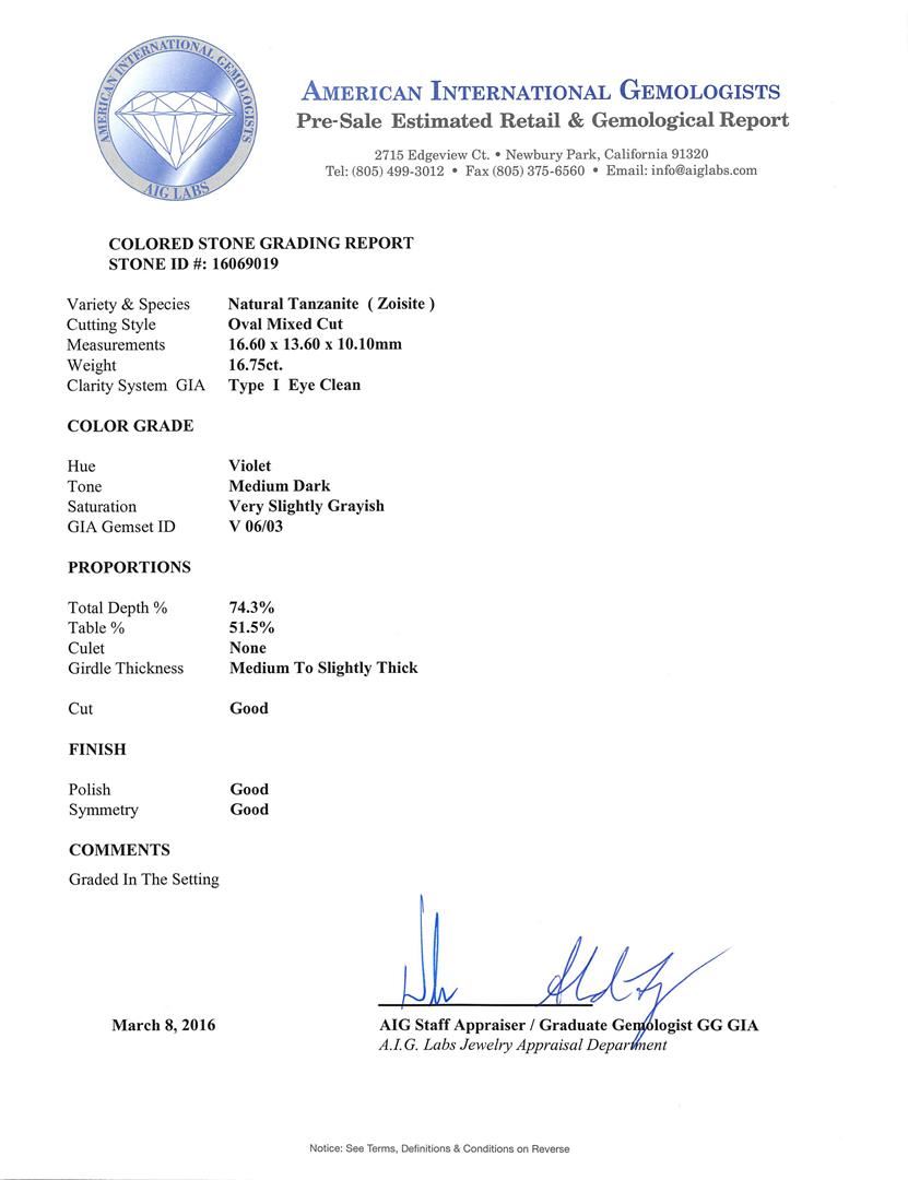 One electronically tested 14KT white gold ladies cast tanzanite and diamond ring with a bright polish finish. The featured tanzanite is set within a diamond bezel supported by a ribbed under gallery and tapering shoulders, completed by a two millimeter wide band. Identified with markings of "14K". Condition is new, good workmanship. Containing: One prong set oval mixed cut natural tanzanite, measuring 16.60 x 13.60 x 10.10mm, approximate weight of 16.75ct., clarity is eye clean, type I, medium dark, very slightly grayish, violet color, (GIA V 6/3), cut is good. Transmitting light with no distortion, transparent. Colored Stone Grading Report attached. Graded in the setting. Tanzanite is a very rare gemstone that is only found in the country of Tanzania. Originally discovered in 1967. Tiffany & Company, named the stone Tanzanite. It is found in the Usumburu Mountains that border the Umba Valley of northern Tanzania. Tanzanite occurs in gray, brown, violet, blue, reddish-purple, & green. The gem is interesting because of its exceptional pleochroism. Rotated in different directions a tanzanite will exhibit multiple changes of color. Tanzanite has a low tolerance to ultrasonic cleaning, and should not be cleaned using this method. Twenty-Four prong set round brilliant cut diamonds approximate total weight of 24 Stones = 0.50ct. Graded in the setting. Clarity: SI-1 to SI-2. Color: D - F. Total Weight of Colored Stones 16.75ct. Total Weight of Diamonds 0.50ct. Total Weight of Ring 10.58gm. AIG Appraised at $39,875.00.