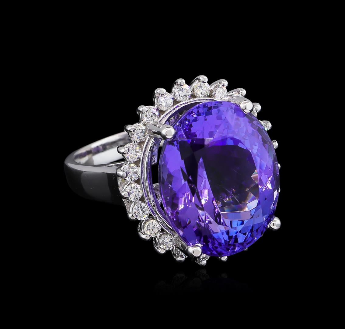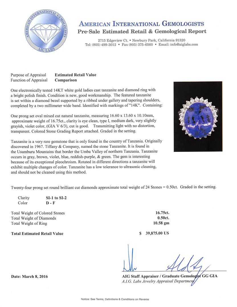 One electronically tested 14KT white gold ladies cast tanzanite and diamond ring with a bright polish finish. The featured tanzanite is set within a diamond bezel supported by a ribbed under gallery and tapering shoulders, completed by a two millimeter wide band. Identified with markings of "14K". Condition is new, good workmanship. Containing: One prong set oval mixed cut natural tanzanite, measuring 16.60 x 13.60 x 10.10mm, approximate weight of 16.75ct., clarity is eye clean, type I, medium dark, very slightly grayish, violet color, (GIA V 6/3), cut is good. Transmitting light with no distortion, transparent. Colored Stone Grading Report attached. Graded in the setting. Tanzanite is a very rare gemstone that is only found in the country of Tanzania. Originally discovered in 1967. Tiffany & Company, named the stone Tanzanite. It is found in the Usumburu Mountains that border the Umba Valley of northern Tanzania. Tanzanite occurs in gray, brown, violet, blue, reddish-purple, & green. The gem is interesting because of its exceptional pleochroism. Rotated in different directions a tanzanite will exhibit multiple changes of color. Tanzanite has a low tolerance to ultrasonic cleaning, and should not be cleaned using this method. Twenty-Four prong set round brilliant cut diamonds approximate total weight of 24 Stones = 0.50ct. Graded in the setting. Clarity: SI-1 to SI-2. Color: D - F. Total Weight of Colored Stones 16.75ct. Total Weight of Diamonds 0.50ct. Total Weight of Ring 10.58gm. AIG Appraised at $39,875.00.