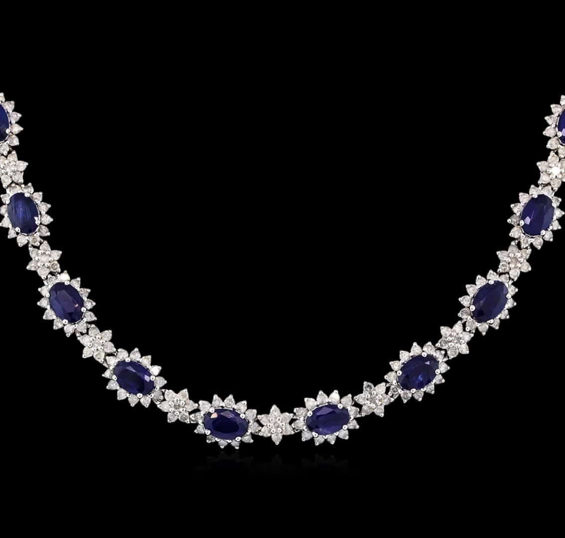 One 14k white gold ladies Michael Christoff necklace (32.93 grams). Containing: 31 Natural Sapphires. Weight: total 16.81 carats. Measurements: 6.10 x 4.10 x 2.50mm. Shape & Cutting: oval-shape, mixed-cut. Color: medium to dark blue, very even color. Cut & Polish: very good. Transparency: transparent. 589 round, brilliant-cut diamonds total 8.93 carats in weight. Average quality is: SI3-I1 clarity grade; H-I color grade. GLS Appraised at $23,500.00.