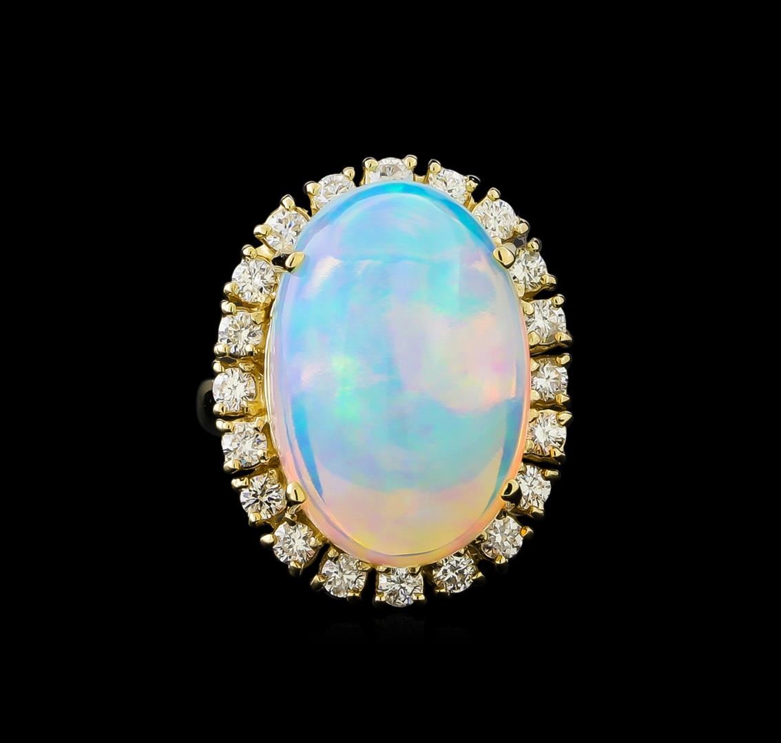 One electronically tested 14KT yellow gold lady's cast fashion ring with a basket halo with a bright polish finish. The featured lady's ring has a shank measuring 2.83 millimeters in width. Identified with markings of "K14". Condition is new, good workmanship. Containing: One crystal opal that is cut in a oval shaped cabochon and is prong set, measuring 20.65 mm long x 13.85 mm wide, and 9.48 mm thick and the approximate weight is 16.90 carats. The opal has a bright, multicolor play of color (fire) in a broad flashfire pattern; a high dome; a good cut; no inclusions in its brightness and pattern; and is. Transmitting light somewhat diffusely, transparent to translucent. Graded in the setting. Twenty prong set round brilliant cut diamonds, measuring 2.40 - 2.30 x 1.46mm (depth est.) approximate total weight of 20 Stones = 1.01ct. Graded in the setting. Clarity: SI-1 to SI-2. Color: H - I. Cut Good. Total Weight of Diamonds 1.01ct. Total Weight of Opals 16.90ct. Total Weight of Ring 10.10gm. GAS Appraised at $8,785.00.