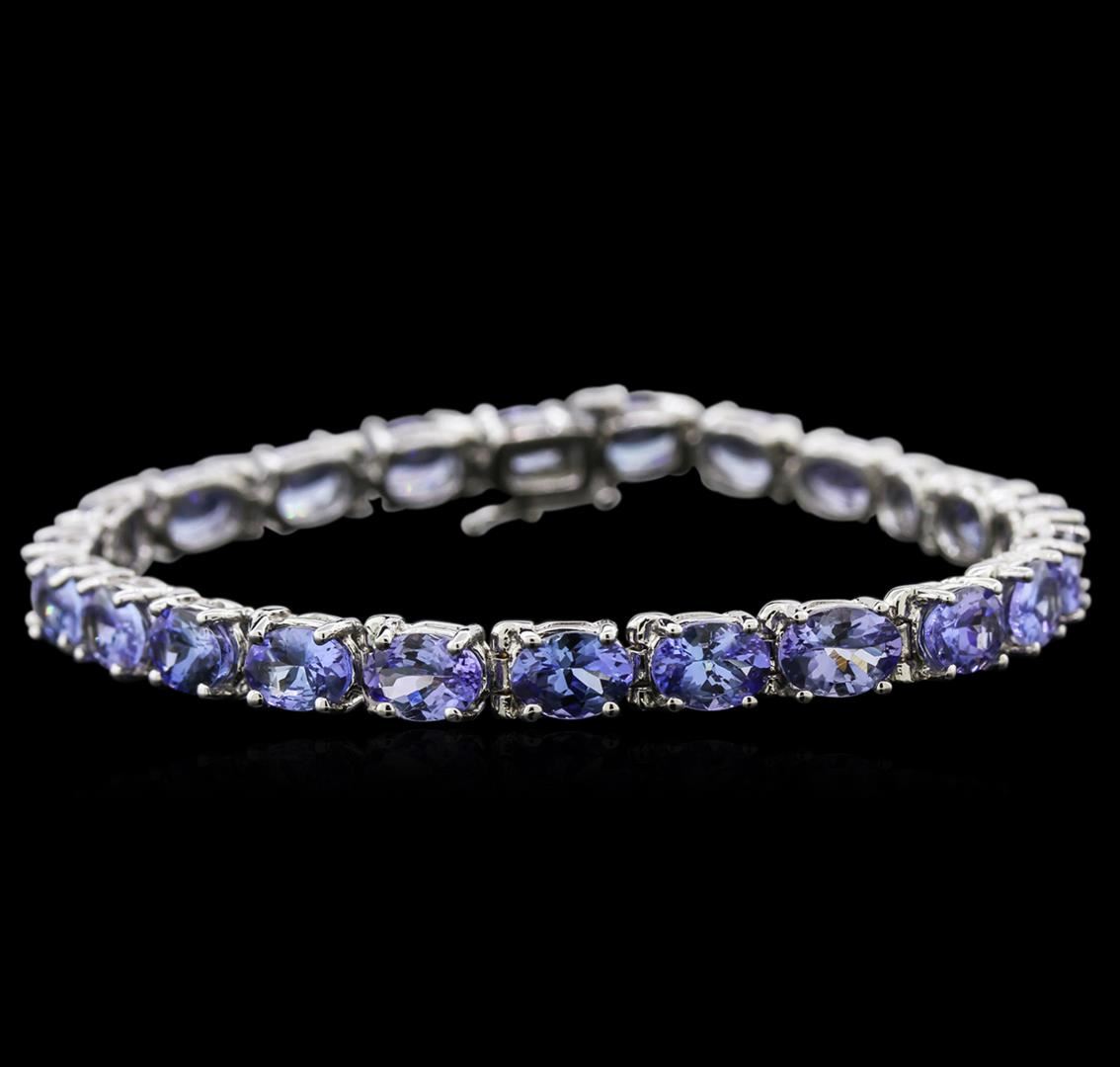One stamped & tested 14KT white gold lady's combination cast & assembled bracelet with a safety clasp with a bright polish finish. Condition is new. 7" in length. Identified with markings of "14K". Containing: Twenty-three prong set oval brilliant cut natural tanzanites, measuring 7.10 x 5.10 x 3.23mm, approximate total weight of 16.97ct., clarity is eye clean, type I, medium, very slightly grayish, violetish blue color, (GIA vB 5/3), cut is good. Colored gemstones are presumed to have been subjected to commonly used enhancement processes. Graded in setting. Total Weight of Colored Stones: 16.97ct. Total Weight of Bracelet: 16.80 gm. GAS Appraised at $9,945.00.