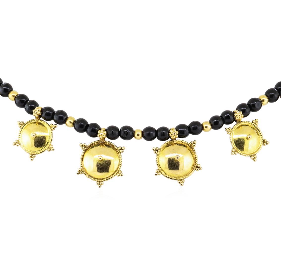 One black bead station necklace with cultural accents featuring: 22KT yellow gold weighing 10.9 grams containing approximately 5 grams of black beads.