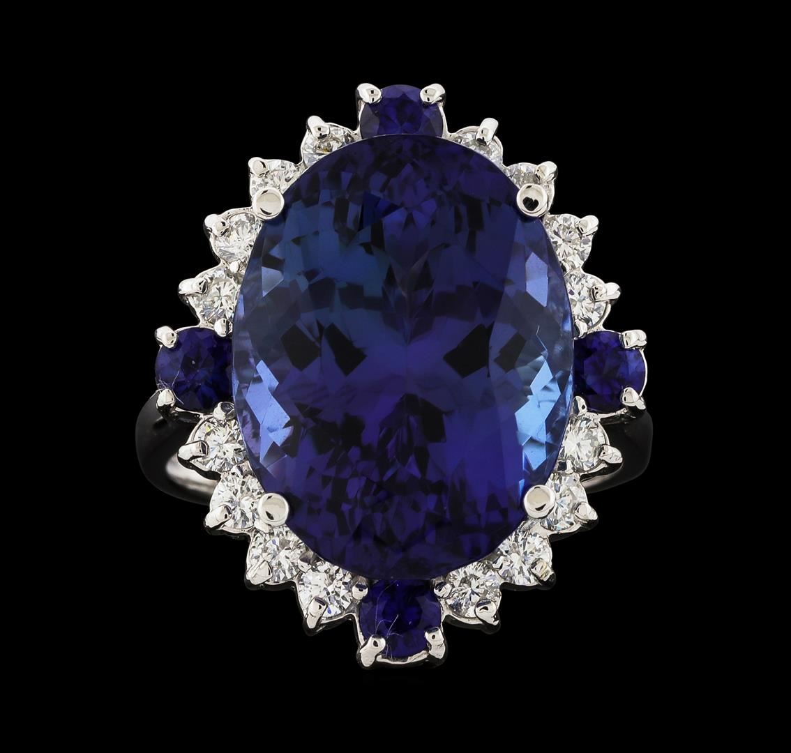One electronically tested 14KT white gold lady's cast fashion ring with a cathedral shank with a basket halo with a bright polish finish. The featured lady's ring has a shank measuring 2.90 millimeters wide. Identified with markings of 'K14'. Condition is new, good workmanship. Containing: One prong set oval modified brilliant cut natural tanzanite, measuring 17.38 x 13.10 x 10.00mm, (depth est.) 7%. bulge factor, approximate weight of 17.13ct., clarity is eye clean, medium dark, very slightly grayish, bluish violet color, (GIA bV 6/3), cut is very good. Transmitting light with no distortion, transparent. Colored gemstones are presumed to have been subjected to commonly used enhancement processes. Graded in the setting. Four prong set round modified brilliant cut natural blue sapphires, measuring 3.10 - 3.00 x 1.98 mm, (depth est.) approximate total weight of 0.65ct., clarity is eye clean, medium dark, strong, blue color, (GIA B 6/5), cut is very good. Transmitting light with no distortion, transparent. Colored gemstones are presumed to have been subjected to commonly used enhancement processes. Graded in the setting. Sixteen prong set round brilliant cut diamonds, measuring 2.25 - 2.15 x 1.34mm (depth est.) approximate total weight of 16 Stones = 0.63ct. Graded in the setting. Clarity SI-1 to SI-2. Color: H - I Cut Good. Total Weight of Colored Stones 17.78ct.. Total Weight of Diamonds 0.63ct.. Total Weight of Ring 10.60gm. GAS Appraised at $23,060.00.