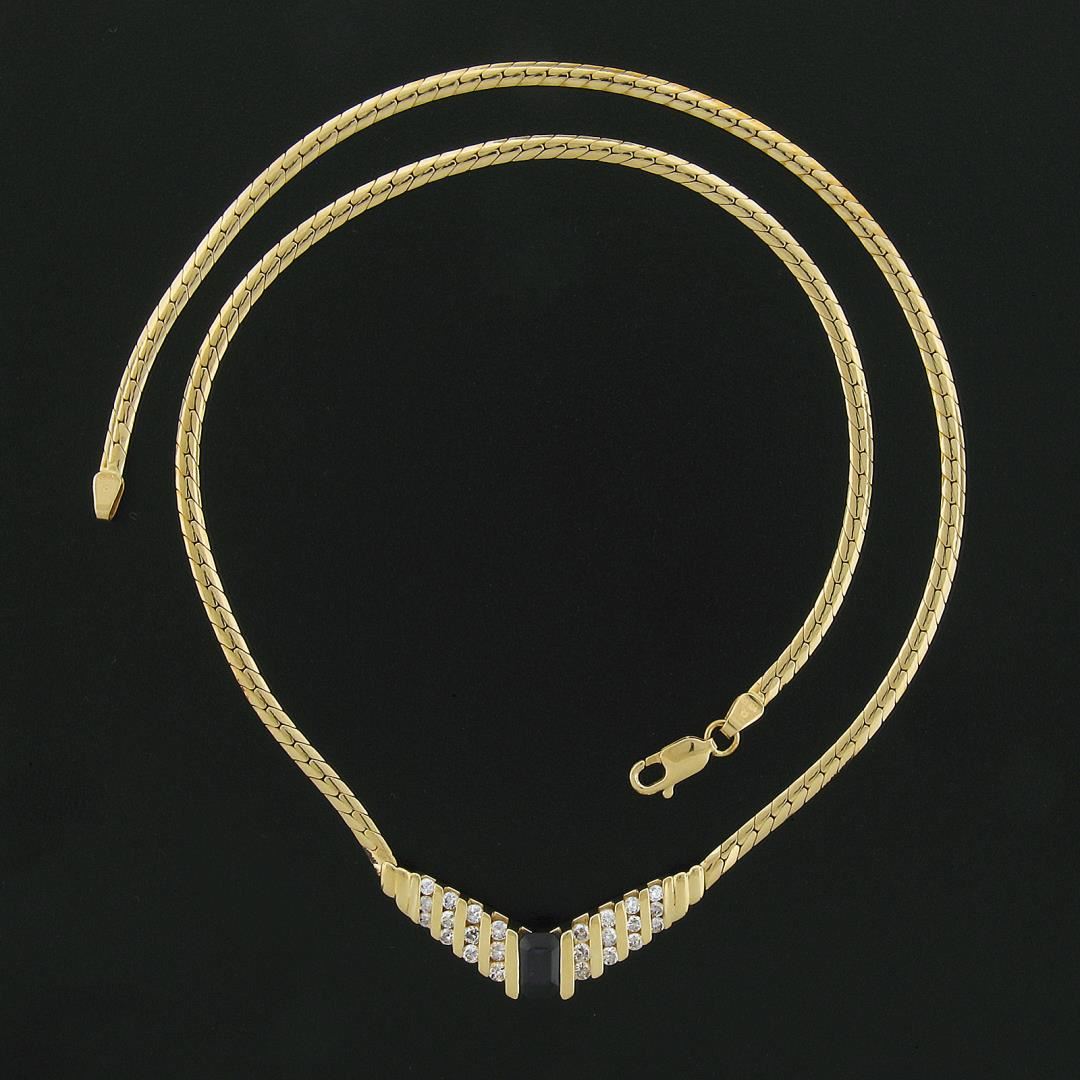 A solid 14k yellow gold chevron necklace, with 1 emerald cut natural sapphire (7x4.5mm / 1.05ct ), and 24 round brilliant cut natural diamonds (G/H - SI2/I1 ; 0.60ctw). 17 inch fancy flat link chain, 14.24 grams total weight, center piece measures 14x34.6mm.