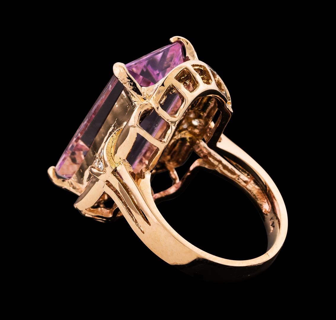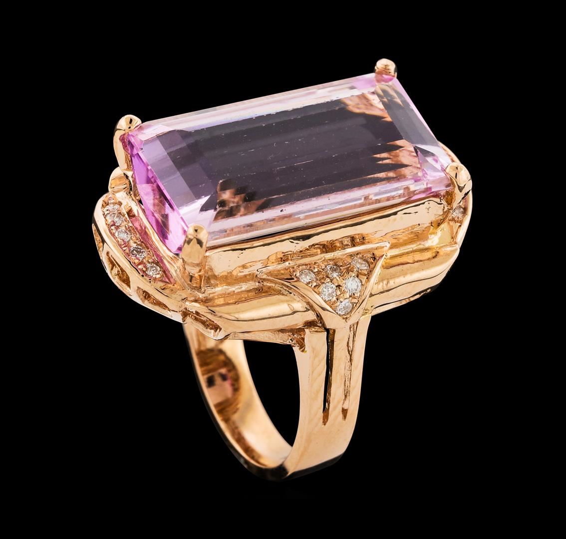 One Kunzite and Diamond Ring featuring: 14KT Rose Gold with a total weight of 7.63 grams, One Kunzite stone with a total weight of 17.17ct, and 22 Diamonds with a total weight of 0.20ctw.