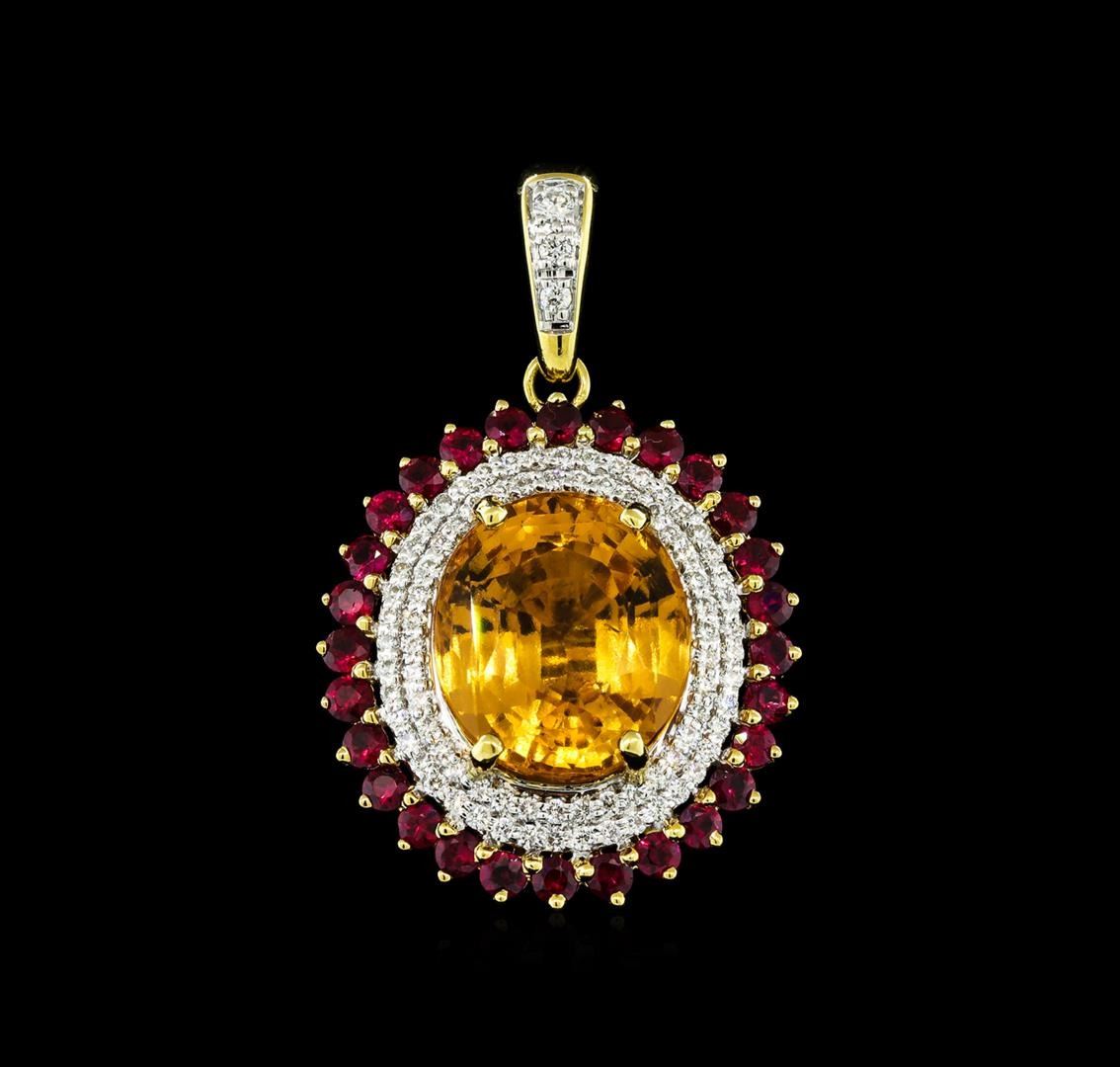 One electronically tested 14KT yellow gold lady's combination cast & assembled fashion pendant with a triple basket halo with a bright polish finish. The featured lady's pendant measures 41 millimeters in length. Identified with markings of '18K'. Condition is new, good workmanship. Containing: One prong set oval modified brilliant cut natural hessonite garnet, measuring 15.50 x 13.15 x 9.60mm, (depth est.) approximate weight of 15.05ct., clarity is slightly included, medium, brownish, yellowish orange color, (GIA yO 5/3), cut is very good. Transmitting light with a minimum of distortion, transparent. Colored gemstones are presumed to have been subjected to commonly used enhancement processes. Graded in the setting. Twenty-eight prong set round modified brilliant cut natural rubies, measuring 2.50 - 2.40 x 1.59 mm, (depth est.) approximate total weight of 2.20ct., clarity is eye clean, medium dark, moderately strong, red color, (GIA R 6/4), cut is very good. Transmitting light with no distortion, transparent. Colored gemstones are presumed to have been subjected to commonly used enhancement processes. Graded in the setting. Three prong set round brilliant cut diamonds, measuring 2.20 - 2.00 x 1.30mm (depth est.) approximate total weight of 3 Stones = 0.10ct. Graded in the setting. Clarity VS-2 to SI-1. Color: G - H Cut Good Eighty-Two prong set round brilliant cut diamonds, measuring 1.35 - 1.25 x 0.80mm (depth est.) approximate total weight of 82 Stones = 0.68ct. Graded in the setting. Clarity VS-1 to SI-1. Color: G - H Cut Very Good. Total Weight of Colored Stones 17.25ct.. Total Weight of Diamonds 0.78ct.. Total Weight of Pendant 11.00gm GAS Appraised at $15,740.00.