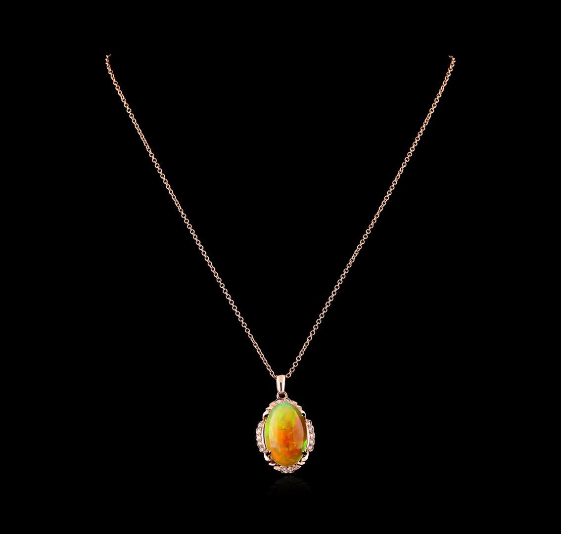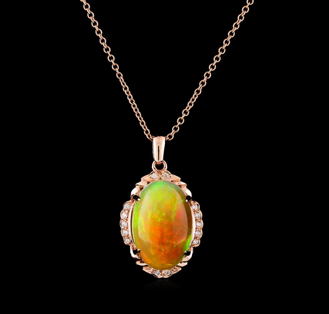 One electronically tested 14KT rose gold lady's combination cast & assembled fashion pendant & chain 18.0" long, 1.8mm round cable link with a lobster claw clasp with a bright polish finish. The featured lady's pendant has a drop measurement of 38 millimeters in length. Identified with markings of "14K". Condition is new, good workmanship. Containing: Fourteen bead set round brilliant cut diamonds, measuring 1.60 - 1.50 x 0.97mm (depth est.) approximate total weight of 14 Stones = 0.20ct. Graded in the setting. Clarity: SI-1 to SI-2. Color: G - Good One crystal opal that is cut in a oval shaped cabochon and is prong set, measuring 22.62 mm long x 15.14 mm wide, and 10.45 mm thick and the approximate weight is 17.30 carats. The opal has a somewhat bright, green-orange play of color (fire) in a rolling flashfire pattern; a high dome; a good cut; no inclusions; consistent in its brightness and pattern; and is somewhat directional. Graded in the setting. Total Weight of Diamonds 0.20ct. Total Weight of Opals 17.30ct. Total Weight of Pendant & Chain 12.90gm. GAS Appraised at $6,120.00.