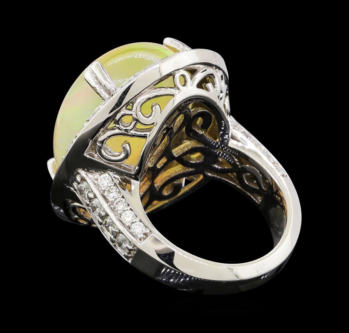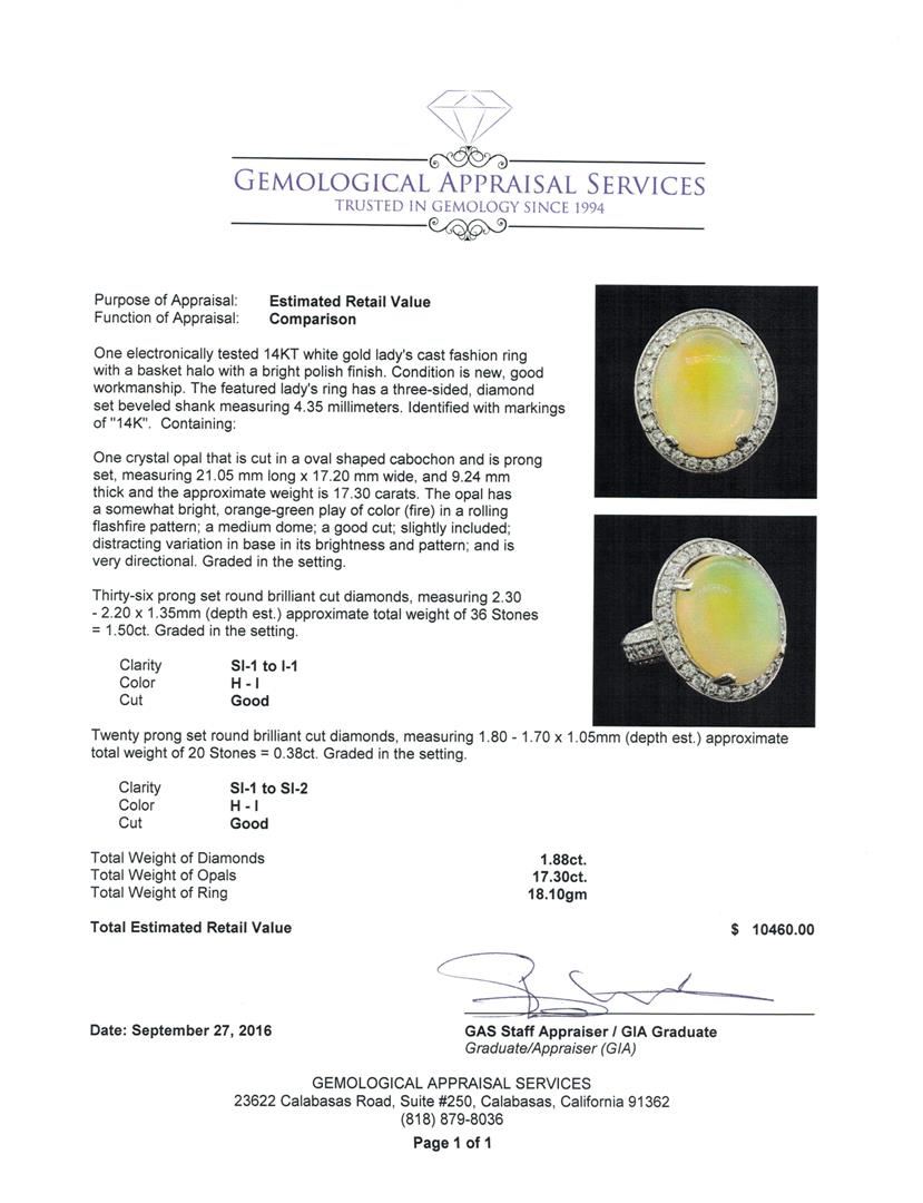 One electronically tested 14KT white gold lady's cast fashion ring with a basket halo with a bright polish finish. The featured lady's ring has a three-sided, diamond set beveled shank measuring 4.35 millimeters. Identified with markings of '14K'. Condition is new, good workmanship. Containing: One crystal opal that is cut in a oval shaped cabochon and is prong set, measuring 21.05 mm long x 17.20 mm wide, and 9.24 mm thick and the approximate weight is 17.30 carats. The opal has a somewhat bright, orange-green play of color (fire) in a rolling flashfire pattern; a medium dome; a good cut; slightly included; distracting variation in base in its brightness and pattern; and is very directional. Graded in the setting. Thirty-Six prong set round brilliant cut diamonds, measuring 2.30 - 2.20 x 1.35mm (depth est.) approximate total weight of 36 Stones = 1.50ct. Graded in the setting. Clarity SI-1 to I-1. Color: H - I Cut Good Twenty prong set round brilliant cut diamonds, measuring 1.80 - 1.70 x 1.05mm (depth est.) approximate total weight of 20 Stones = 0.38ct. Graded in the setting. Clarity SI-1 to SI-2. Color: H - I Cut Good. Total Weight of Diamonds 1.88ct.. Total Weight of Opals 17.30ct.. Total Weight of Ring 18.10gm. GAS Appraised at $10,460.00.