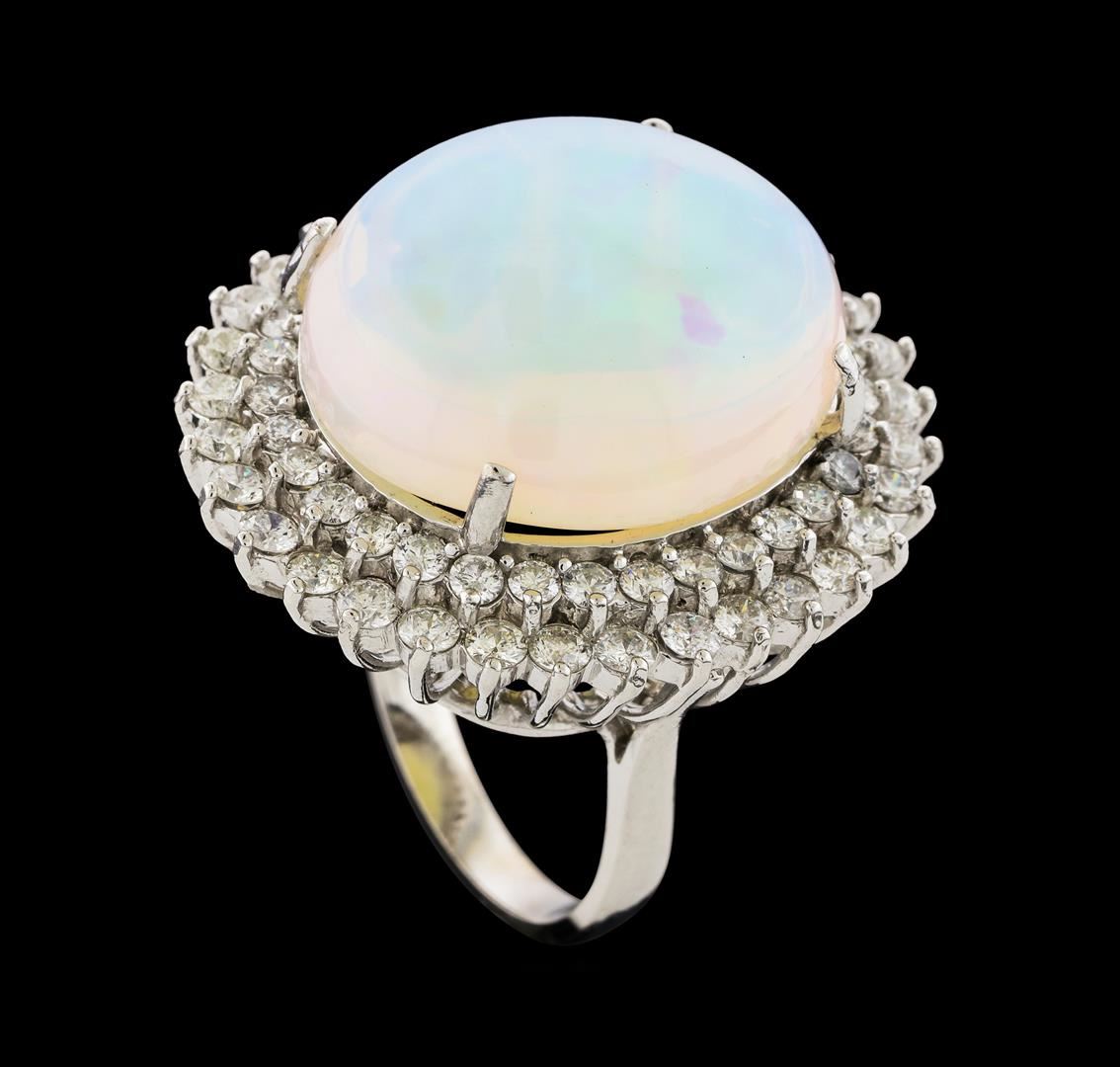 One electronically tested 14KT white gold lady's cast fashion ring with a double basket halo with a bright polish finish. The featured lady's ring has a shank measuring 2.66 millimeters wide. Identified with markings of 'K14'. Condition is new, good workmanship. Containing: Thirty-Two prong set round brilliant cut diamonds, measuring 2.40 - 2.35 x 1.43mm (depth est.) approximate total weight of 32 Stones = 1.58ct. Graded in the setting. Clarity SI-1 to I-1. Color: G - H Cut Good Thirty-Two prong set round brilliant cut diamonds, measuring 2.10 - 2.00 x 1.27mm (depth est.) approximate total weight of 32 Stones = 1.06ct. Graded in the setting. Clarity SI-1 to SI-2. Color: G - H Cut Good One crystal opal that is cut in a oval shaped cabochon and is prong set, measuring 21.69 mm long x 19.60 mm wide, and 10.61 mm thick and the approximate weight is 17.42 carats. The opal has a somewhat bright, multicolor play of color (fire) in a rolling flashfire pattern; a medium dome; a good cut; no inclusions; slight variation in base in its brightness and pattern; and is slightly directional. Graded in the setting.. Total Weight of Diamonds 2.64ct.. Total Weight of Opals 17.42ct.. Total Weight of Ring 13.70gm. GAS Appraised at $11,135.00.