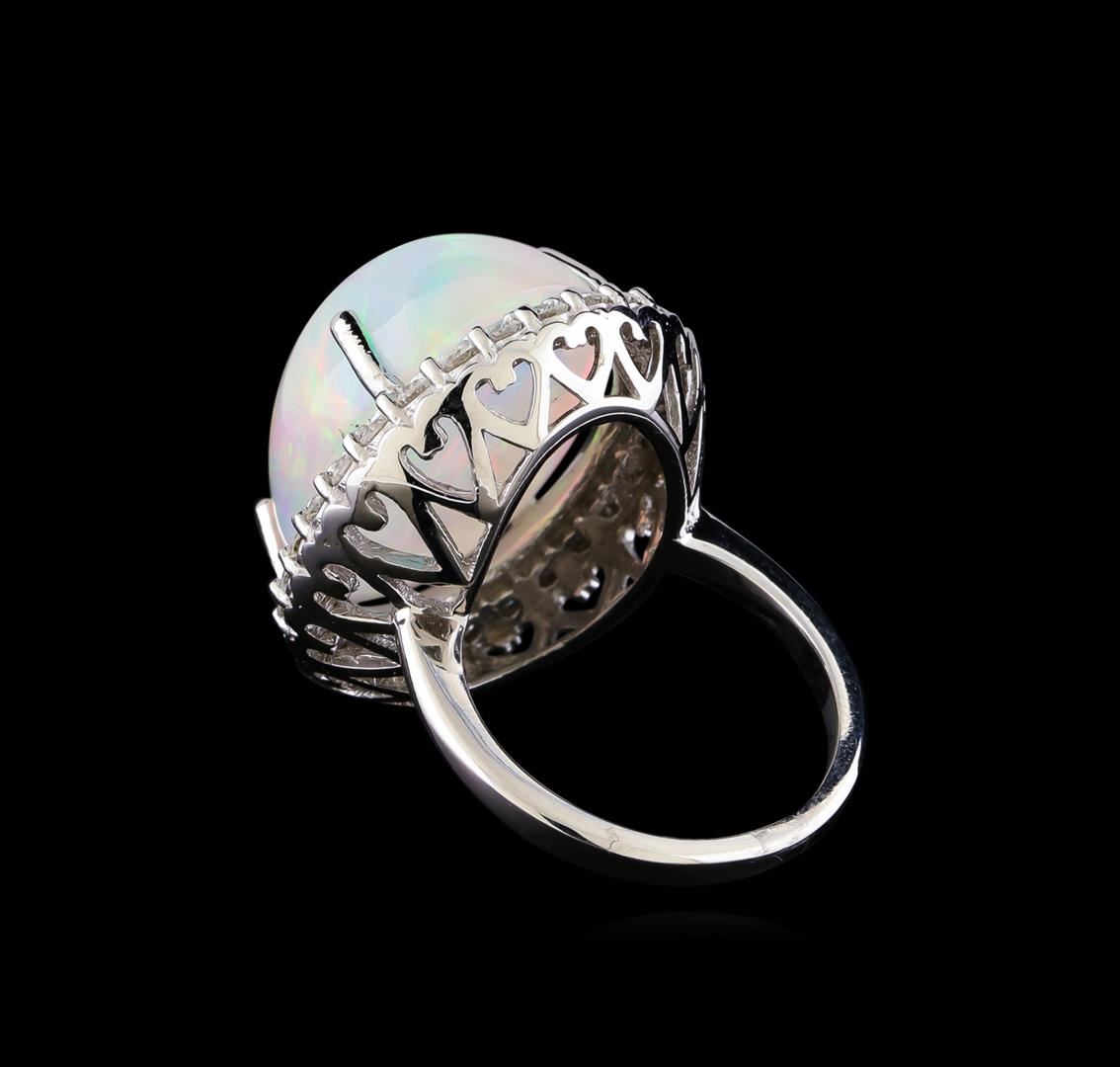 One electronically tested 14KT white gold lady's cast fashion ring with a basket halo with a bright polish finish. The featured lady's ring has a shank measuring 2.40 millimeters in width. Identified with markings of "14K". Condition is new, good workmanship. Containing: One crystal opal that is cut in a oval shaped cabochon and is prong set, measuring 21.50 mm long x 16.20 mm wide, and 10.50 mm thick and the approximate weight is 17.50 carats. The opal has a bright, red multicolor play of color (fire) in a rolling flashfire pattern; a high dome; a good cut; in its brightness and pattern; and is. Twenty-Eight prong set round brilliant cut diamonds, measuring 2.30 - 2.20 x 1.40mm (depth est.) approximate total weight of 28 Stones = 1.18ct. Graded in the setting. Clarity: SI-1 to SI-2. Color: G - Good. Total Weight of Diamonds 1.18ct. Total Weight of Opals 17.50ct. Total Weight of Ring 12.40gm. GAS Appraised at $9,145.00.