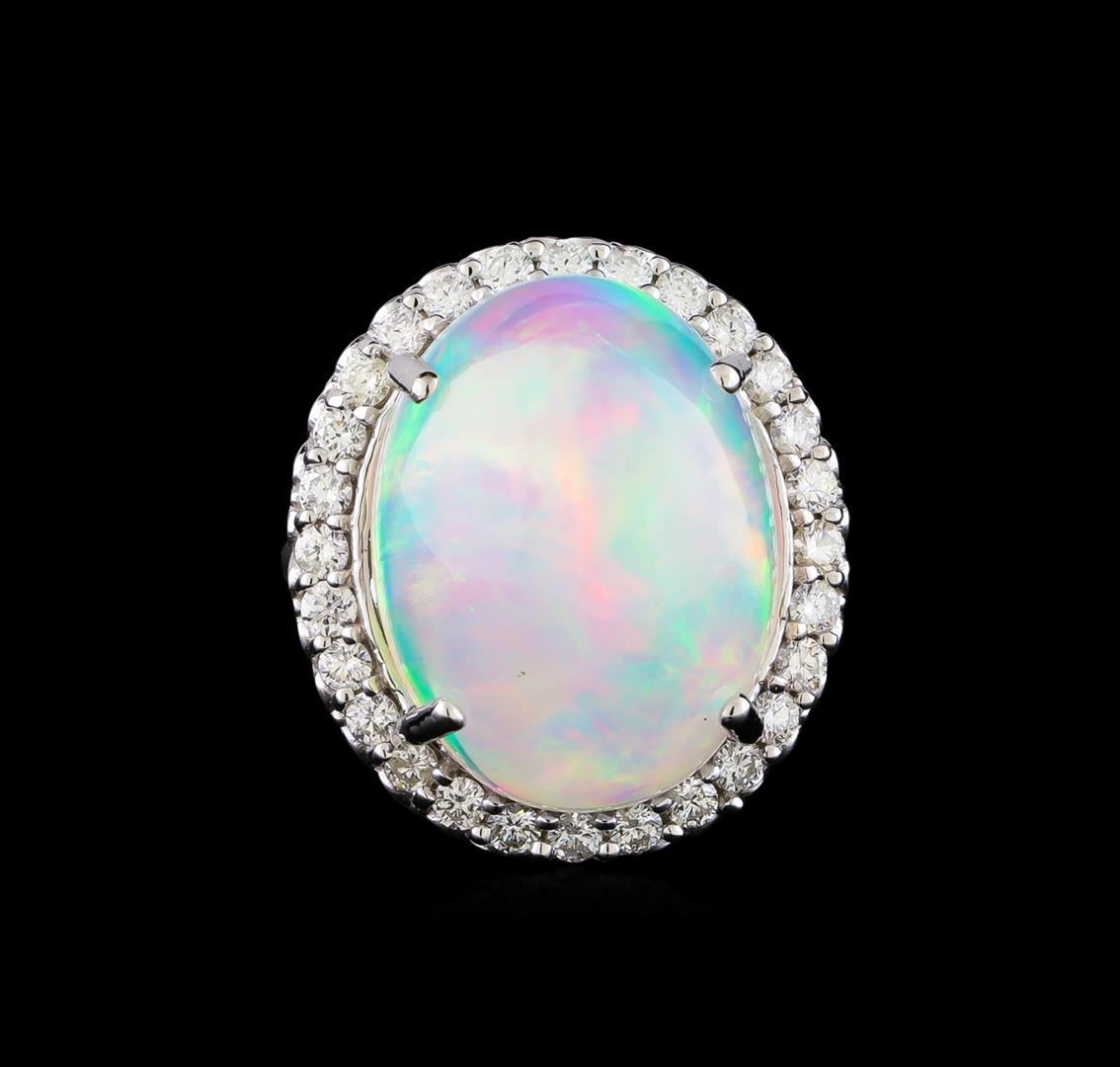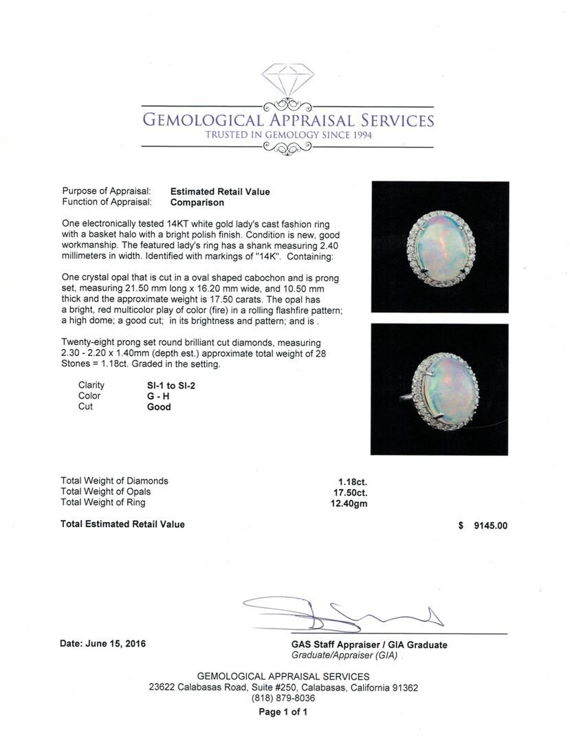 One electronically tested 14KT white gold lady's cast fashion ring with a basket halo with a bright polish finish. The featured lady's ring has a shank measuring 2.40 millimeters in width. Identified with markings of "14K". Condition is new, good workmanship. Containing: One crystal opal that is cut in a oval shaped cabochon and is prong set, measuring 21.50 mm long x 16.20 mm wide, and 10.50 mm thick and the approximate weight is 17.50 carats. The opal has a bright, red multicolor play of color (fire) in a rolling flashfire pattern; a high dome; a good cut; in its brightness and pattern; and is. Twenty-Eight prong set round brilliant cut diamonds, measuring 2.30 - 2.20 x 1.40mm (depth est.) approximate total weight of 28 Stones = 1.18ct. Graded in the setting. Clarity: SI-1 to SI-2. Color: G - Good. Total Weight of Diamonds 1.18ct. Total Weight of Opals 17.50ct. Total Weight of Ring 12.40gm. GAS Appraised at $9,145.00.