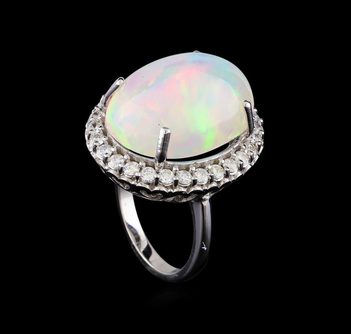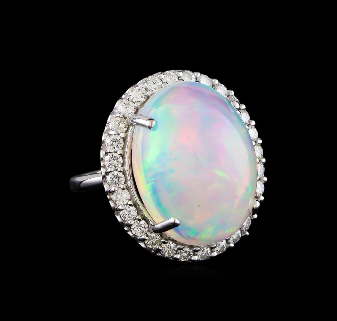 One electronically tested 14KT white gold lady's cast fashion ring with a basket halo with a bright polish finish. The featured lady's ring has a shank measuring 2.40 millimeters in width. Identified with markings of "14K". Condition is new, good workmanship. Containing: One crystal opal that is cut in a oval shaped cabochon and is prong set, measuring 21.50 mm long x 16.20 mm wide, and 10.50 mm thick and the approximate weight is 17.50 carats. The opal has a bright, red multicolor play of color (fire) in a rolling flashfire pattern; a high dome; a good cut; in its brightness and pattern; and is. Twenty-Eight prong set round brilliant cut diamonds, measuring 2.30 - 2.20 x 1.40mm (depth est.) approximate total weight of 28 Stones = 1.18ct. Graded in the setting. Clarity: SI-1 to SI-2. Color: G - Good. Total Weight of Diamonds 1.18ct. Total Weight of Opals 17.50ct. Total Weight of Ring 12.40gm. GAS Appraised at $9,145.00.