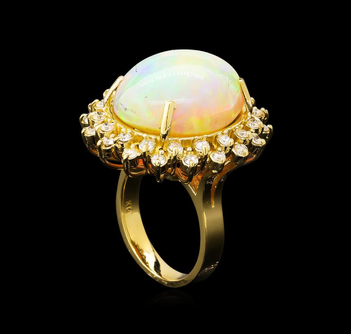 One electronically tested 14KT yellow gold lady's cast fashion ring with a double basket halo with a bright polish finish. The featured lady's ring has a shank measuring 3.50 millimeters wide. Identified with markings of "K14". Condition is new, good workmanship. Containing: One crystal opal that is cut in a oval shaped cabochon and is prong set, measuring 20.27 mm long x 17.15 mm wide, and 11.28 mm thick and the approximate weight is 17.50 carats. The opal has a very bright, red-blue multicolor play of color (fire) in a rolling flashfire pattern; a high dome; a good cut; no inclusions; consistent in its brightness and pattern; and is not directional. Graded in the setting. Thirty-Six prong set round brilliant cut diamonds, measuring 2.10 - 2.00 x 1.23mm (depth est.) approximate total weight of 36 Stones = 1.10ct. Graded in the setting. Clarity: SI-1 to I-1. Color: H - I. Cut Good. Total Weight of Diamonds 1.10ct. Total Weight of Opals 17.50ct. Total Weight of Ring 15.50gm. GAS Appraised at $14,025.00.