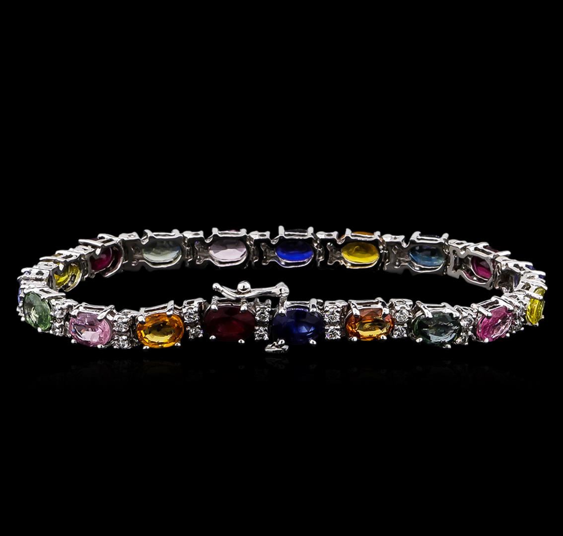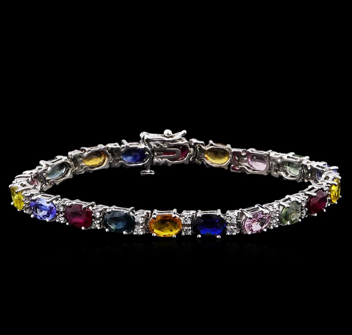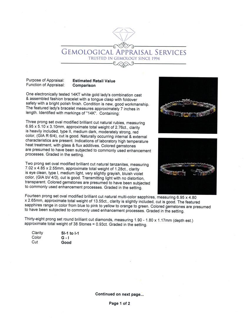 One electronically tested 14KT white gold lady's combination cast & assembled fashion bracelet with a tongue clasp with foldover safety with a bright polish finish. The featured lady's bracelet measures approximately 7 inches in length. Identified with markings of "14K". Condition is new, good workmanship. Containing: Three prong set oval modified brilliant cut natural rubies, measuring 6.95 x 5.10 x 3.10mm, approximate total weight of 2.76ct., clarity is heavily included, type II, medium dark, moderately strong, red color, (GIA R 6/4), cut is good. Naturally occurring internal & external characteristics are present. Indications of laboratory high temperature heat treatment, with glass & flux additives. Colored gemstones are presumed to have been subjected to commonly used enhancement processes. Graded in the setting. Two prong set oval modified brilliant cut natural tanzanites, measuring 7.02 x 4.85 x 2.55mm, approximate total weight of 1.28ct., clarity is eye clean, type I, medium light, very slightly grayish, bluish violet color, (GIA bV 4/3), cut is good. Transmitting light with no distortion, transparent. Colored gemstones are presumed to have been subjected to commonly used enhancement processes. Graded in the setting. Fourteen prong set oval modified brilliant cut natural multi-color sapphires, measuring 6.95 x 4.80 x 2.65mm, approximate total weight of 13.55ct., clarity is slightly included, cut is good. The featured sapphires range in color from blue to pink to yellow to orange to green. Colored gemstones are presumed to have been subjected to commonly used enhancement processes. Graded in the setting. Thirty-Eight prong set round brilliant cut diamonds, measuring 1.90 - 1.80 x 1.17mm (depth est.) approximate total weight of 38 Stones = 0.93ct. Graded in the setting. Clarity: SI-1 to I-1. Color: G - I. Cut Good. Total Weight of Colored Stones 17.59ct. Total Weight of Diamonds 0.93ct. Total Weight of Bracelet 14.20gm. GAS Appraised at $9,120.00.